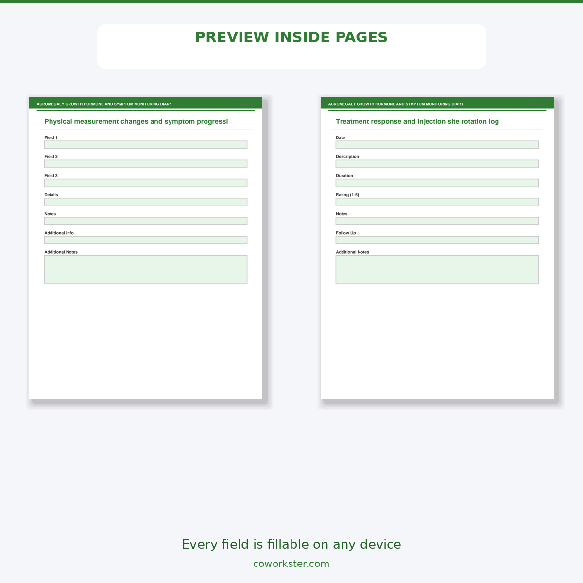 If you have been looking for a acromegaly growth hormone and symptom monitoring diary that actually works the way you need it to, this is it. We designed this 4 page fillable PDF specifically for Acromegaly patients tracking growth hormone levels and symptom changes who want something practical, organized, and ready to use right away.