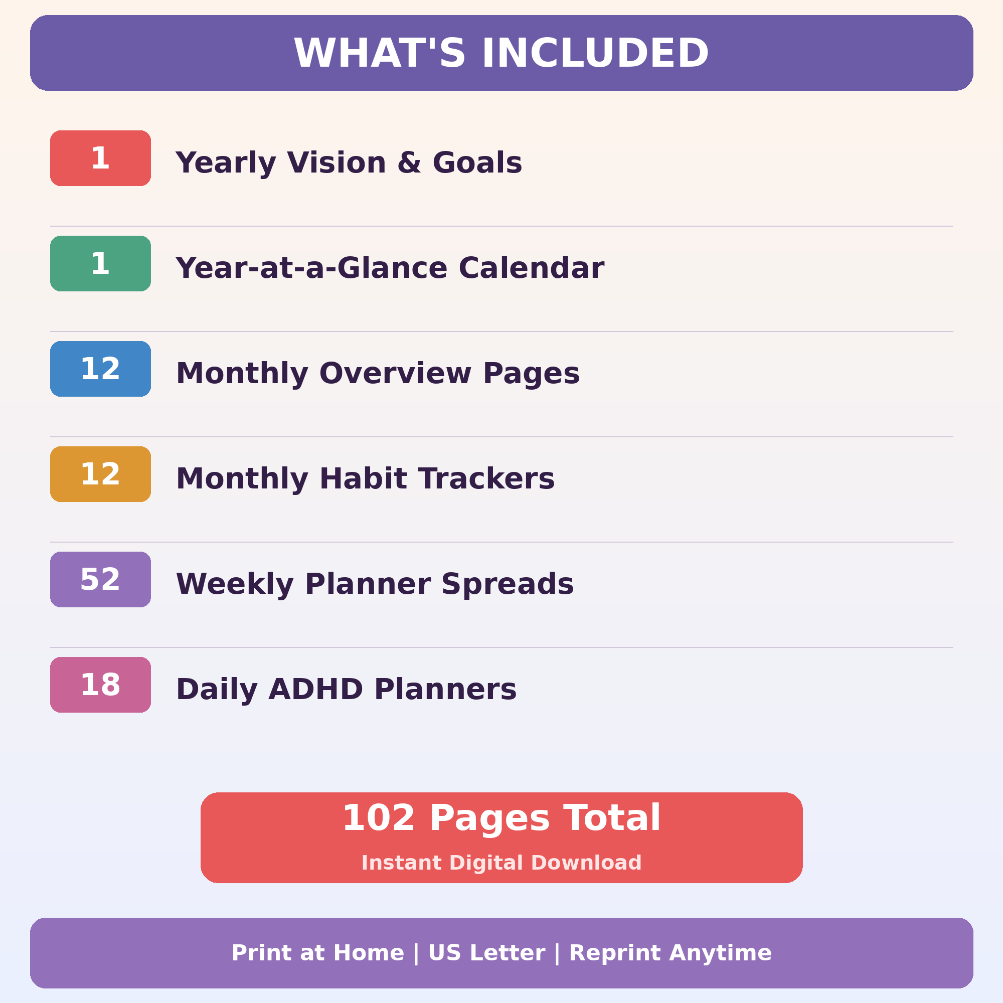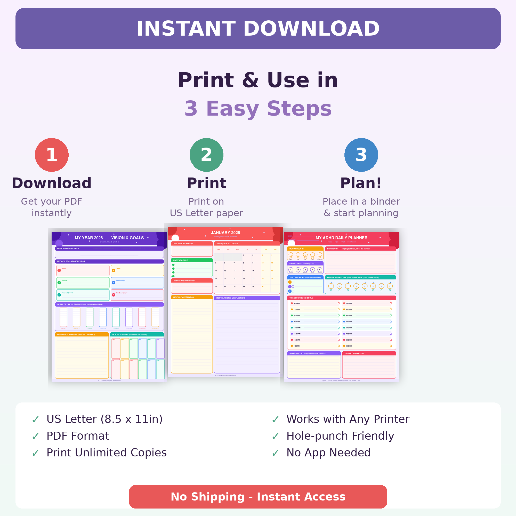 A full-year ADHD planning system for 2026. Monthly overviews, weekly spreads, daily pages, goal setting, and habit tracking — all designed for the ADHD brain. Printable PDF, instant download.