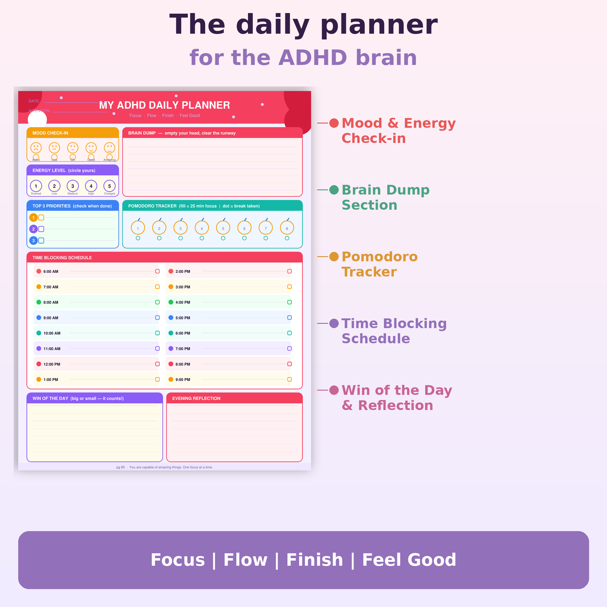 • Daily Planning Templates — energy-based scheduling, task prioritization, and reflection prompts