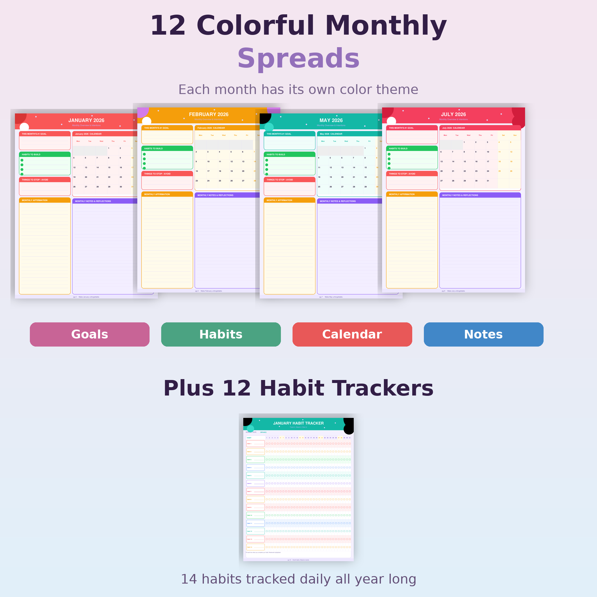 • 12 Monthly Overview Spreads — see each month at a glance with goal slots and priority markers