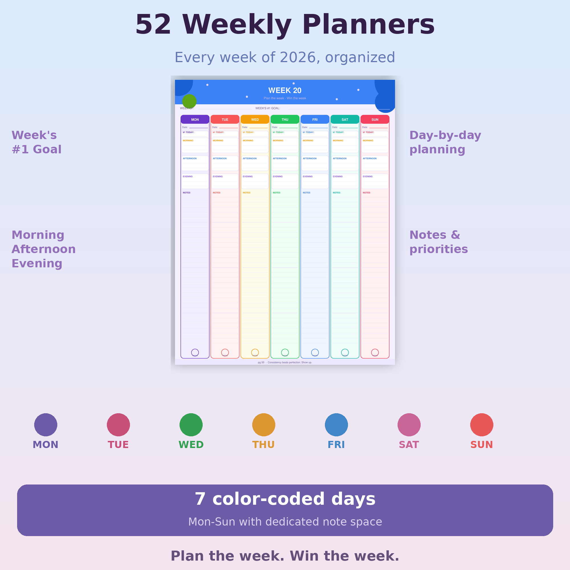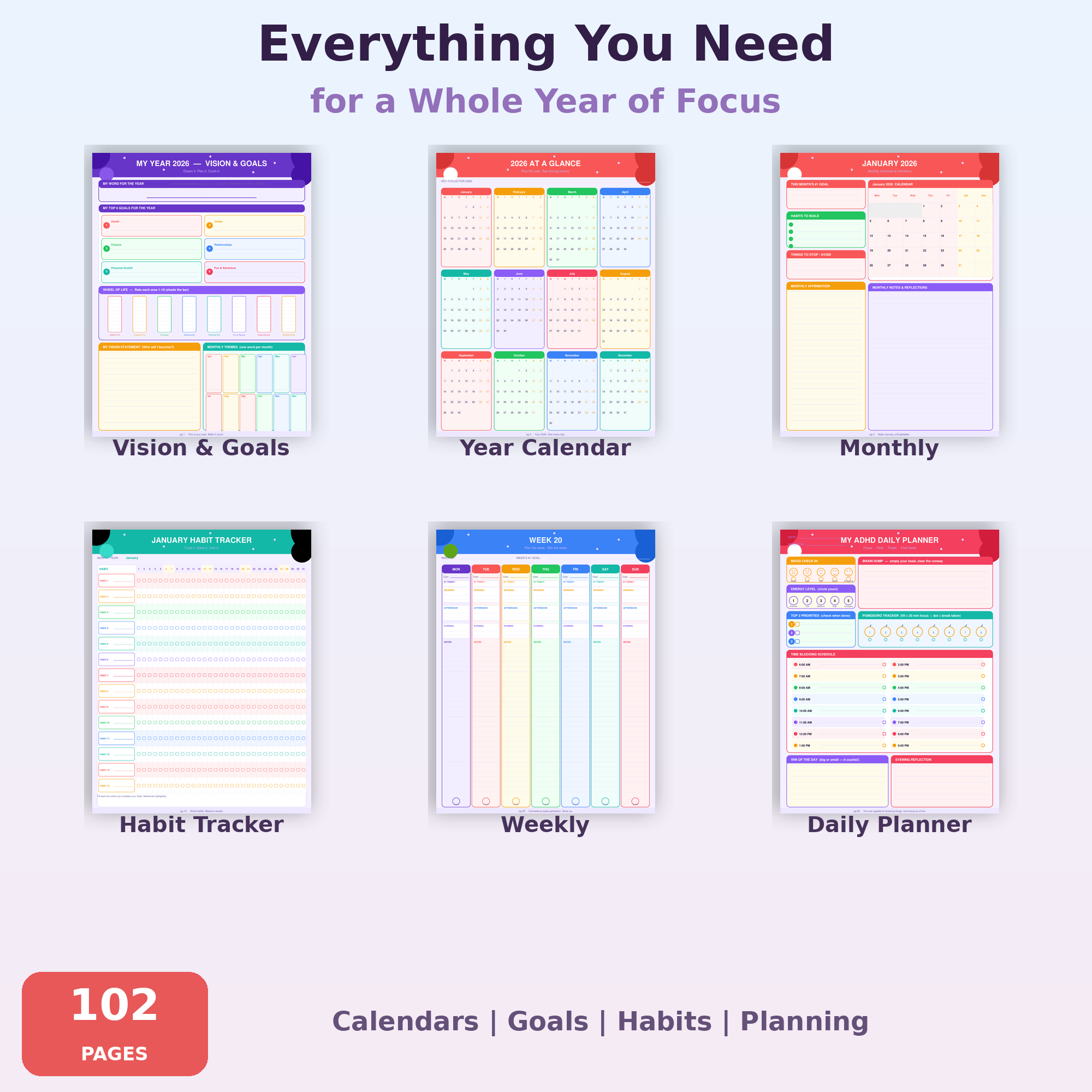 • 52 Weekly Planning Pages — top priorities, time blocks, and brain dump space for every week