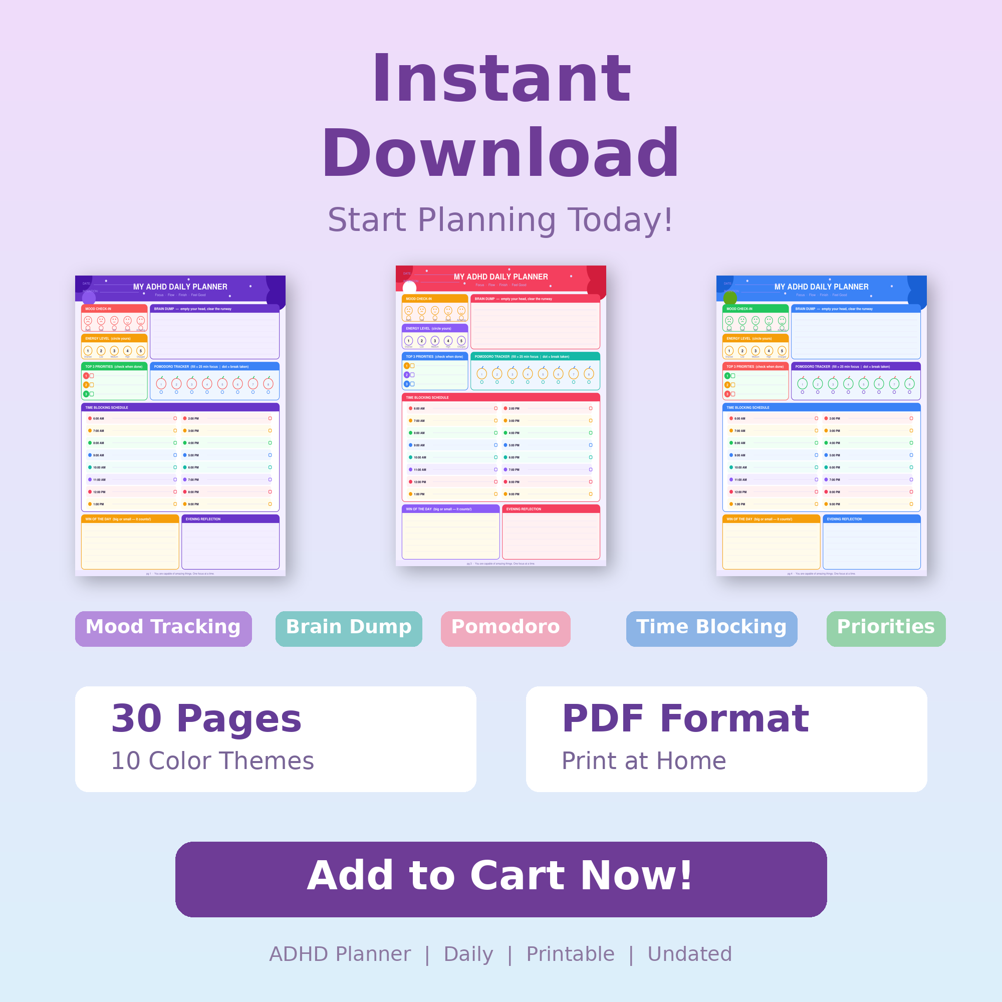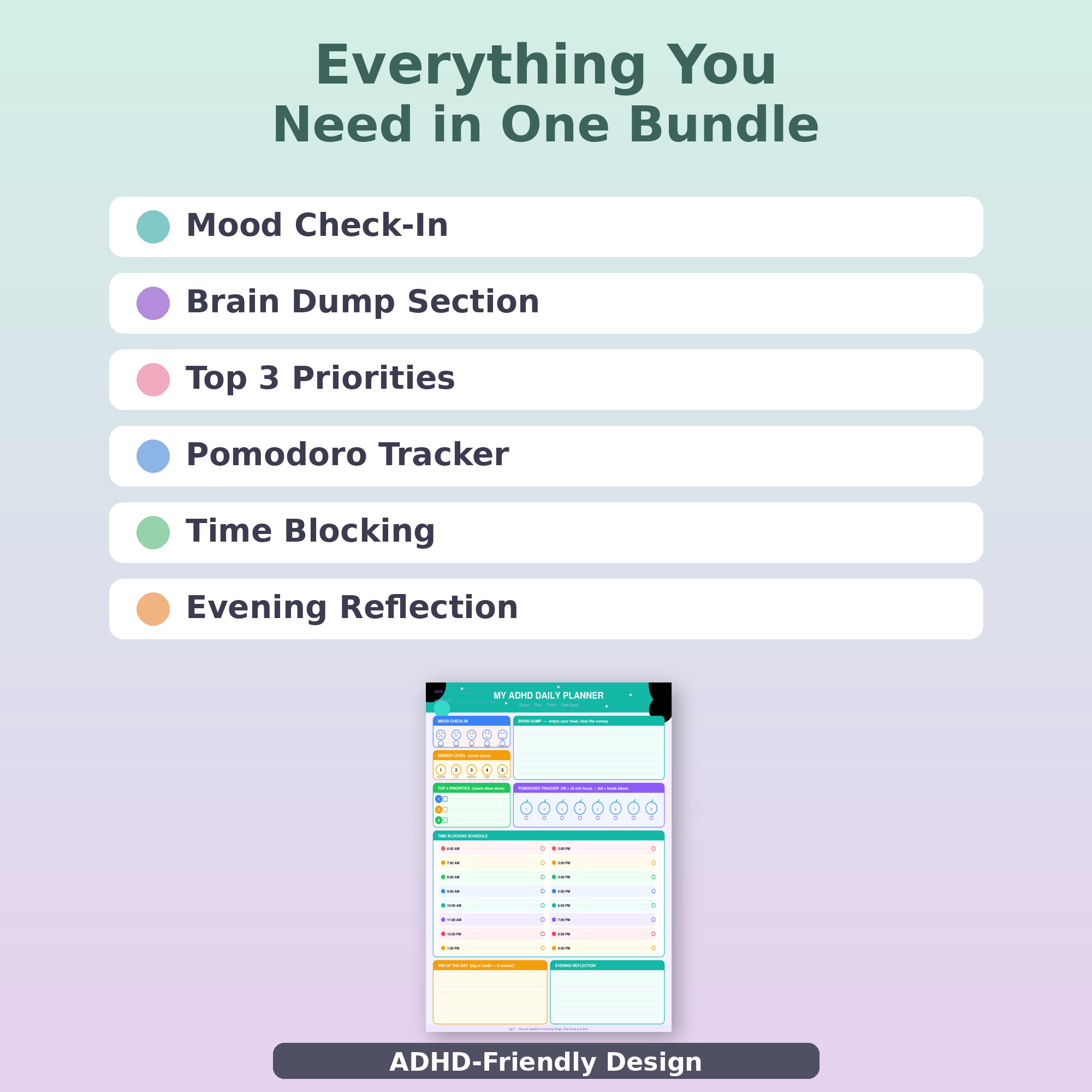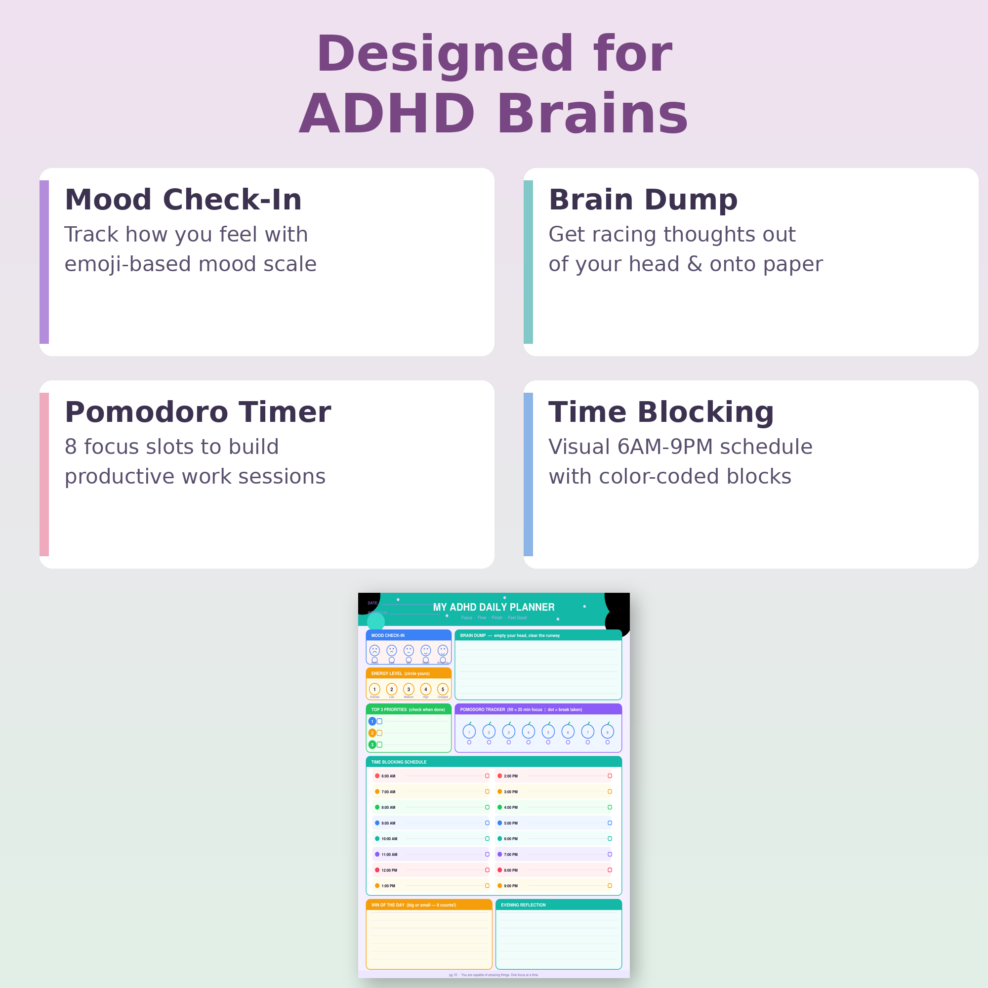 - ADHD Daily Planner — priority-based task system, energy level tracking, time blocking, brain dump section, and end-of-day reflection