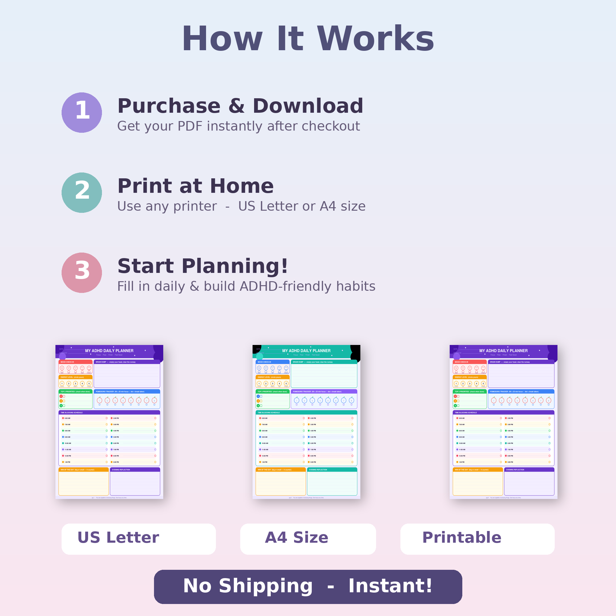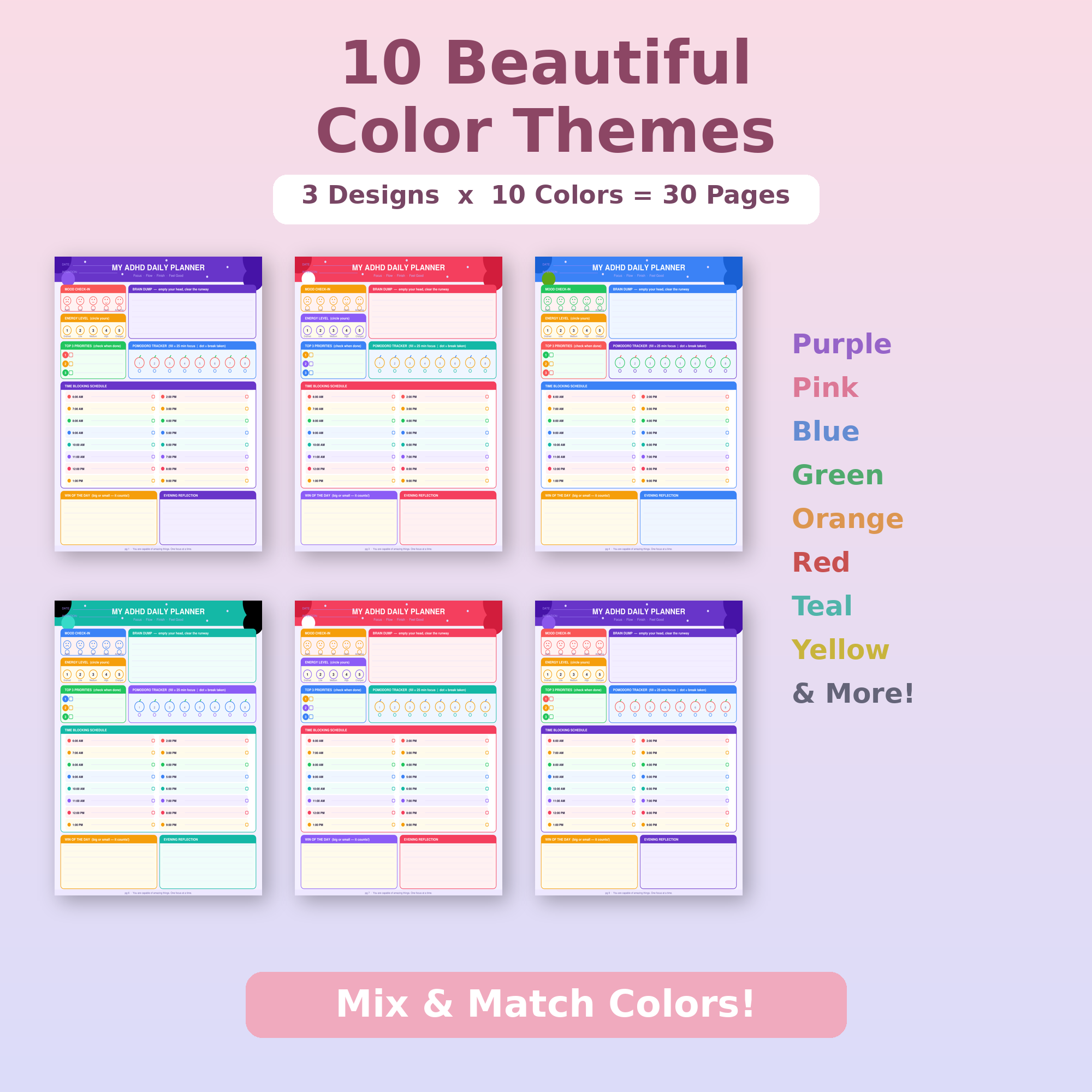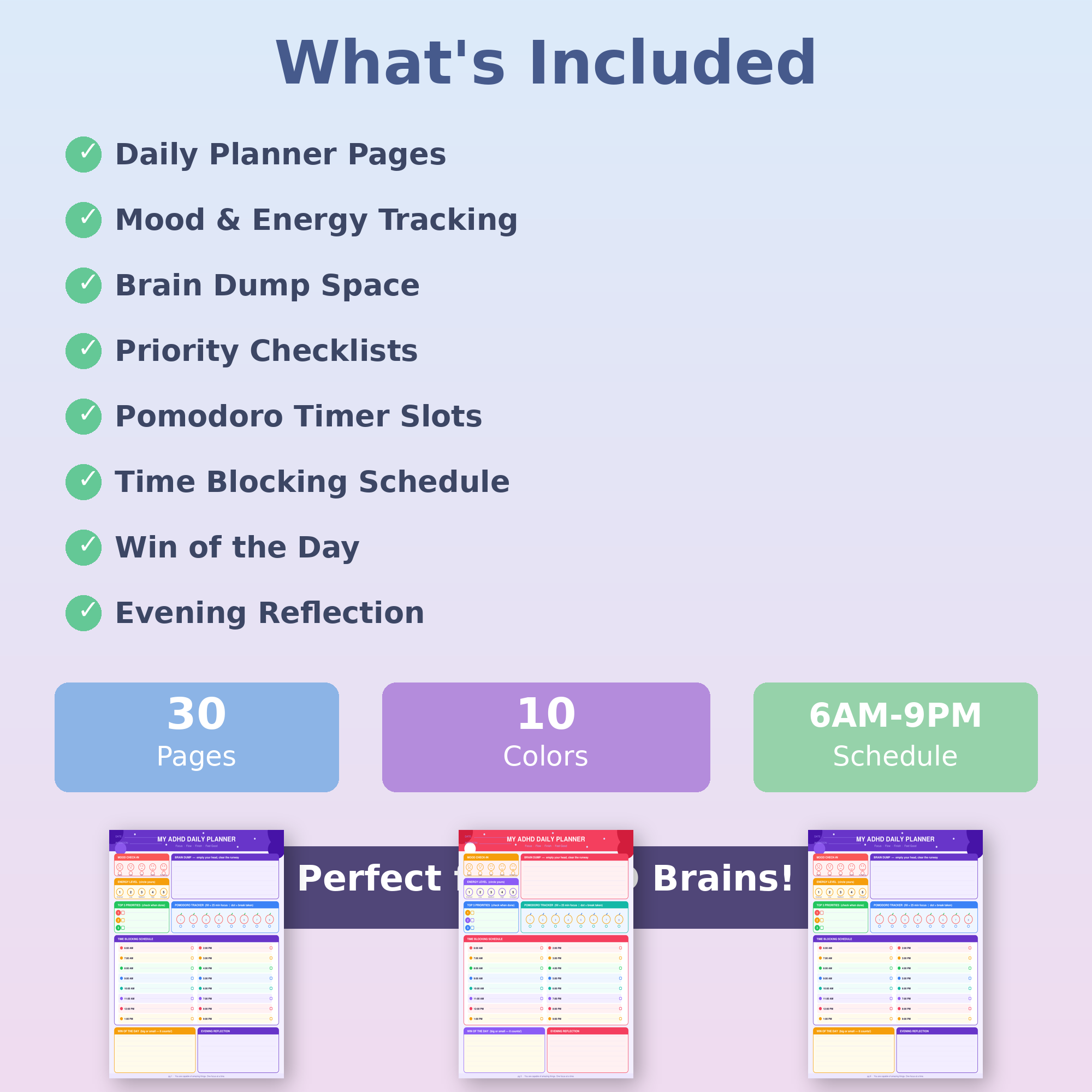 - ADHD Daily Planner — priority-based task system, energy level tracking, time blocking, brain dump section, and end-of-day reflection