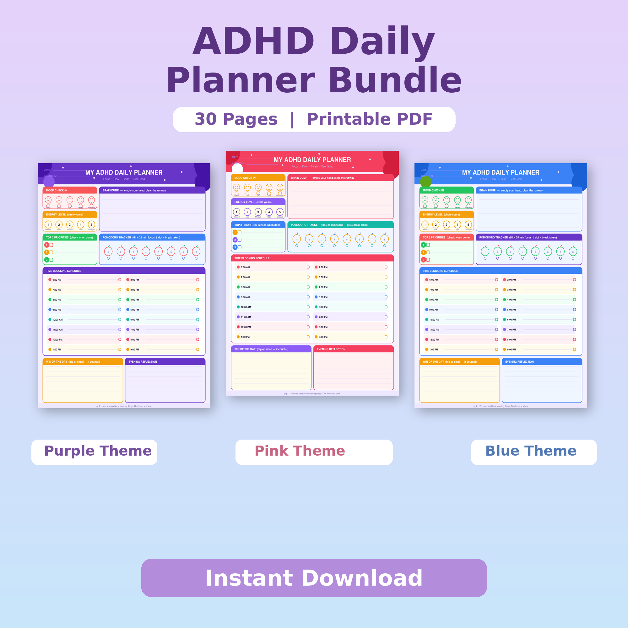 Generic planners don’t work for ADHD. This 3-Pack ADHD Planner Bundle is designed with neurodivergent minds in mind — visual priority systems, dopamine-friendly checkboxes, and layouts that reduce overwhelm instead of creating it.