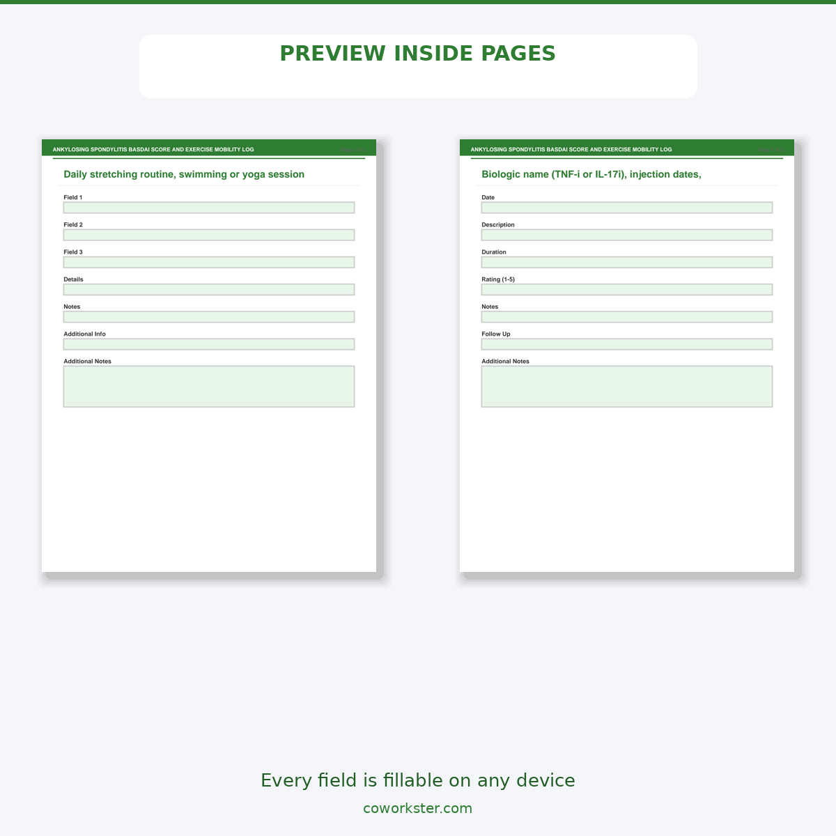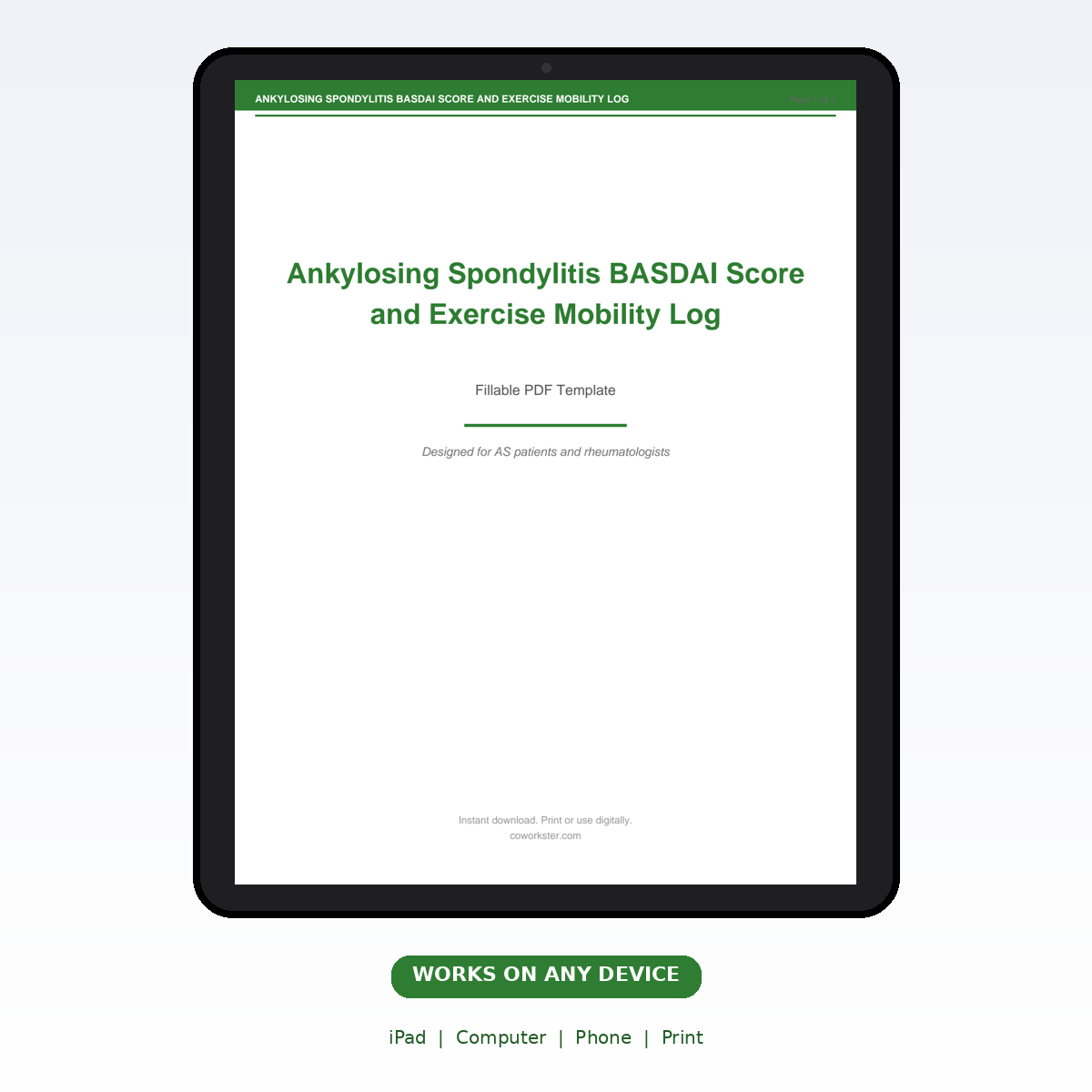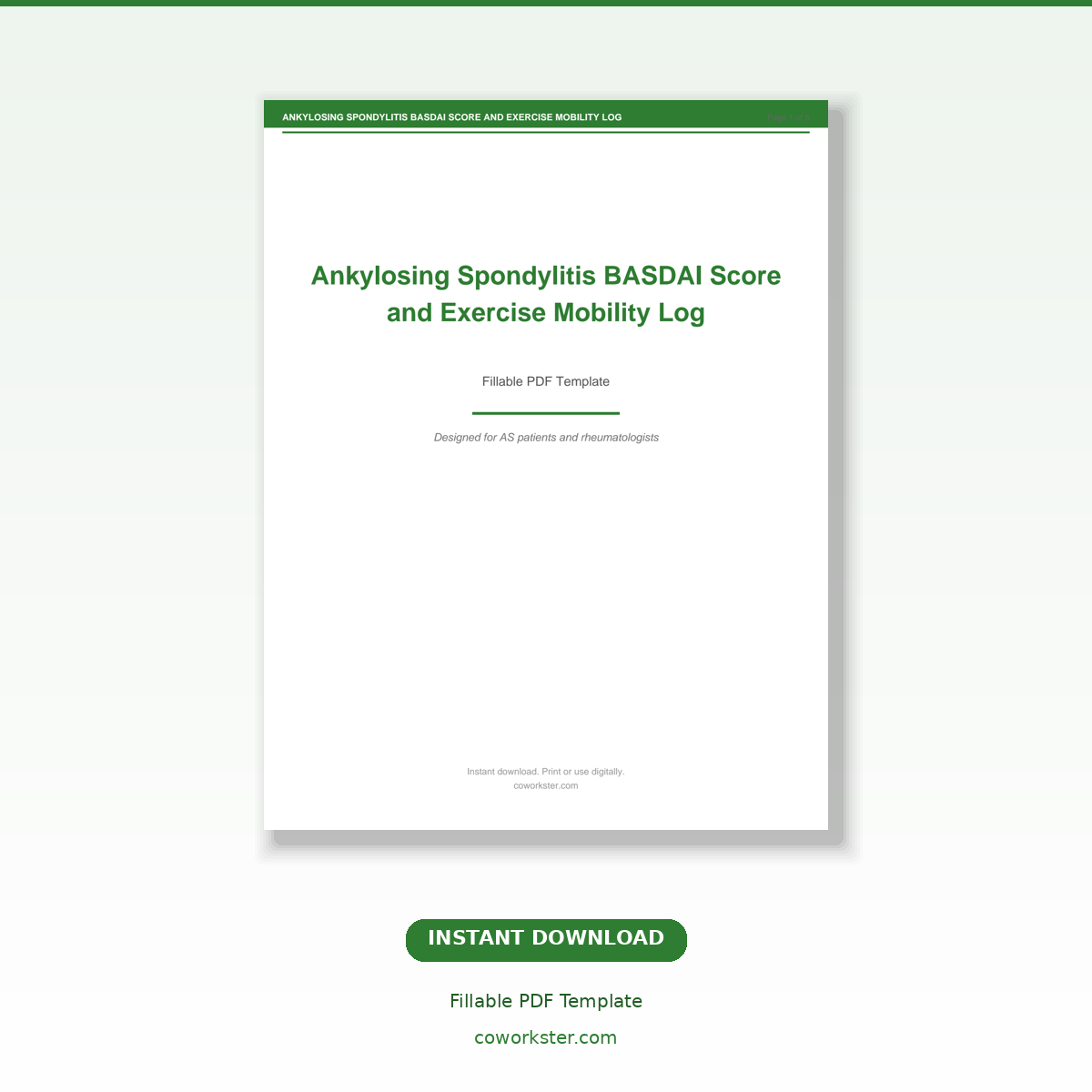 If you have been looking for a ankylosing spondylitis basdai score and exercise mobility log that actually works the way you need it to, this is it. We designed this 5 page fillable PDF specifically for AS patients and rheumatologists who want something practical, organized, and ready to use right away.