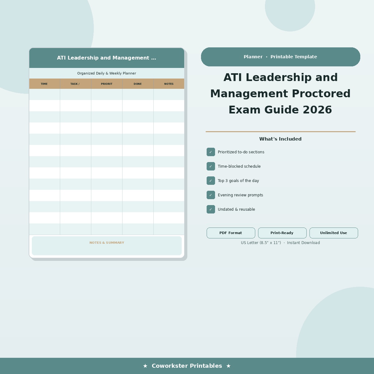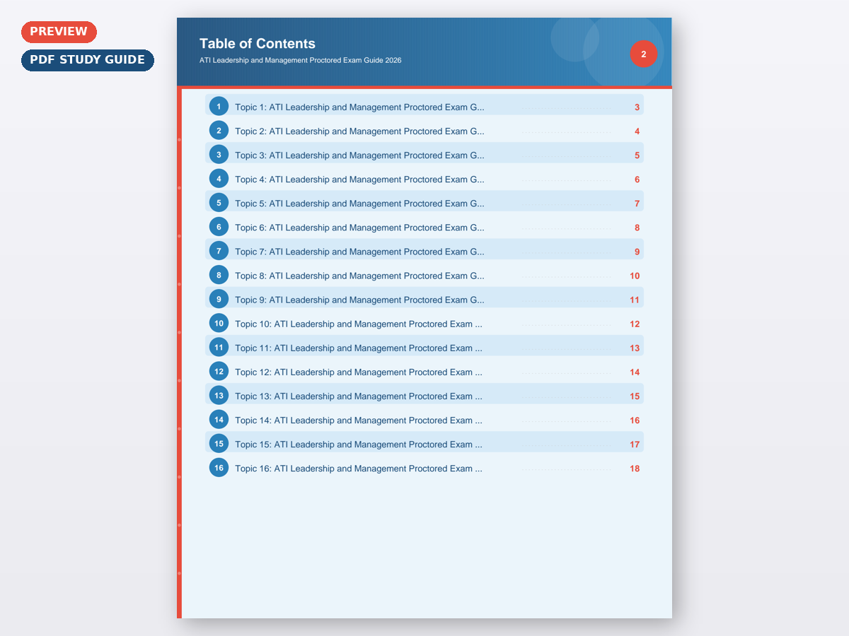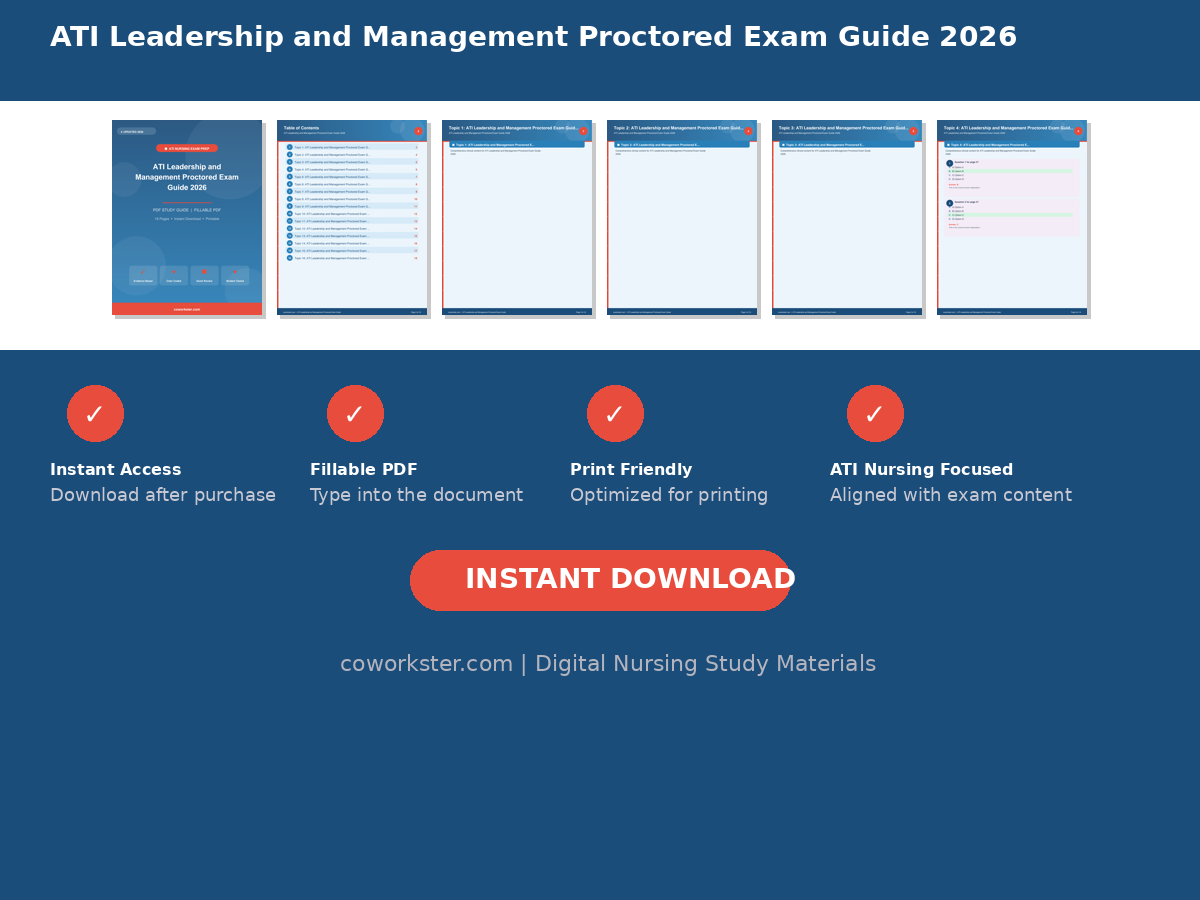 This digital download includes 18 professionally designed pages covering Topic 1: ATI Leadership and Management Proctored Exam Guide 2026, Topic 2: ATI Leadership and Management Proctored Exam Guide 2026, Topic 3: ATI Leadership and Management Proctored Exam Guide 2026, Topic 4: ATI Leadership and Management Proctored Exam Guide 2026, Topic 5: ATI Leadership and Management Proctored Exam Guide 2026, Topic 6: ATI Leadership and Management Proctored Exam Guide 2026, Topic 7: ATI Leadership and Management Proctored Exam Guide 2026, Topic 8: ATI Leadership and Management Proctored Exam Guide 2026, Topic 9: ATI Leadership and Management Proctored Exam Guide 2026, Topic 10: ATI Leadership and Management Proctored Exam Guide 2026, Topic 11: ATI Leadership and Management Proctored Exam Guide 2026, Topic 12: ATI Leadership and Management Proctored Exam Guide 2026, Topic 13: ATI Leadership and Management Proctored Exam Guide 2026, Topic 14: ATI Leadership and Management Proctored Exam Guide 2026, Topic 15: ATI Leadership and Management Proctored Exam Guide 2026, and Topic 16: ATI Leadership and Management Proctored Exam Guide 2026. Every page features a clean, color coded layout that makes complex nursing concepts easy to scan and review. The fillable PDF format means you can type directly into the document on your computer, tablet, or phone, or print it out and write by hand. Either way, you have a study tool that works the way you study.