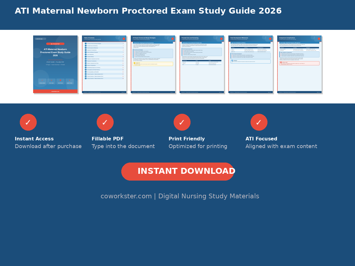 This digital download includes 19 professionally designed pages covering ATI Exam Format and Study Strategies, Prenatal Care and Screening, Fetal Development Milestones, Antepartum Complications, Labor and Delivery Processes, Labor Medications, Cesarean Delivery, Postpartum Assessment and Care, Postpartum Complications, Newborn Assessment and Care, Newborn Complications, Breastfeeding Support and Teaching, Contraception and Family Planning, Rh Incompatibility and RhoGAM, Practice Questions – Maternal Newborn Set 1, Practice Questions – Maternal Newborn Set 2, and Practice Questions – Maternal Newborn Set 3. Every page features a clean, color coded layout that makes complex nursing concepts easy to scan and review. The fillable PDF format means you can type directly into the document on your computer, tablet, or phone, or print it out and write by hand. Either way, you have a study tool that works the way you study.
