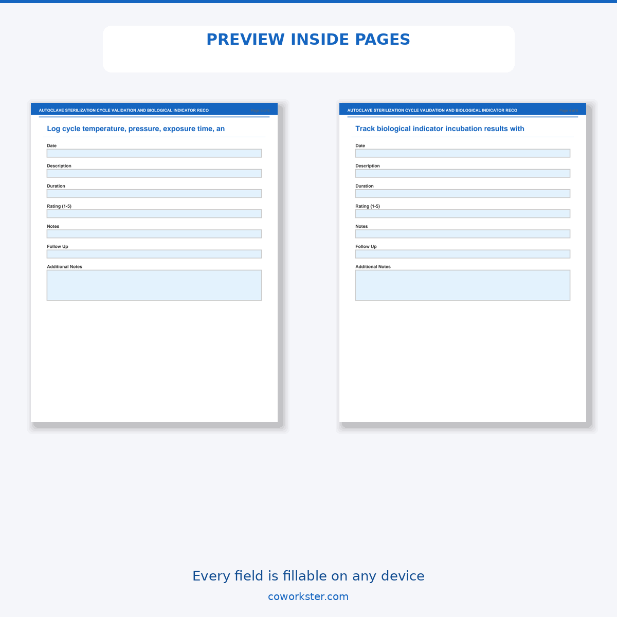 If you have been looking for a autoclave sterilization cycle validation and biological indicator record that actually works the way you need it to, this is it. We designed this 6 page fillable PDF specifically for Sterilization technicians in healthcare and laboratory settings who want something practical, organized, and ready to use right away.