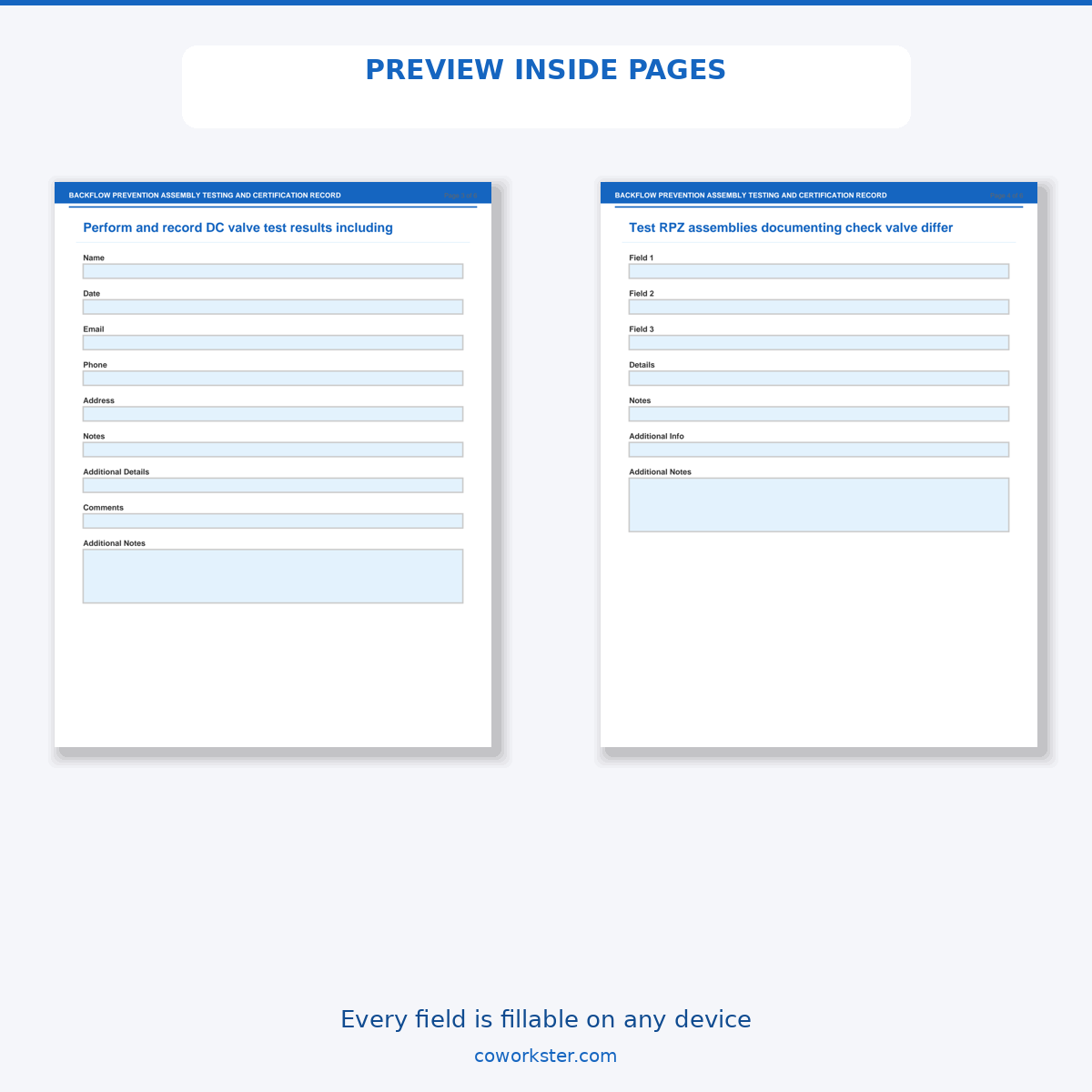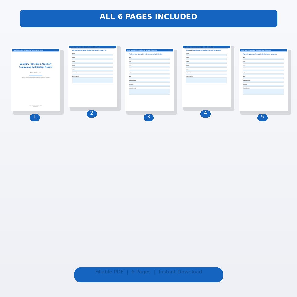 A [‘Assembly Identification’, ‘Test Equipment Calibration’, ‘Double Check Valve Test’, ‘Reduced Pressure Zone Test’, ‘Repair Documentation’, ‘Annual Certification Form’] page fillable PDF template designed for Backflow testing technicians and water utility managers. Covers everything you need in one organized, professional document. Just open it, fill in the fields, and you are ready to go. Works on any device or print it out.