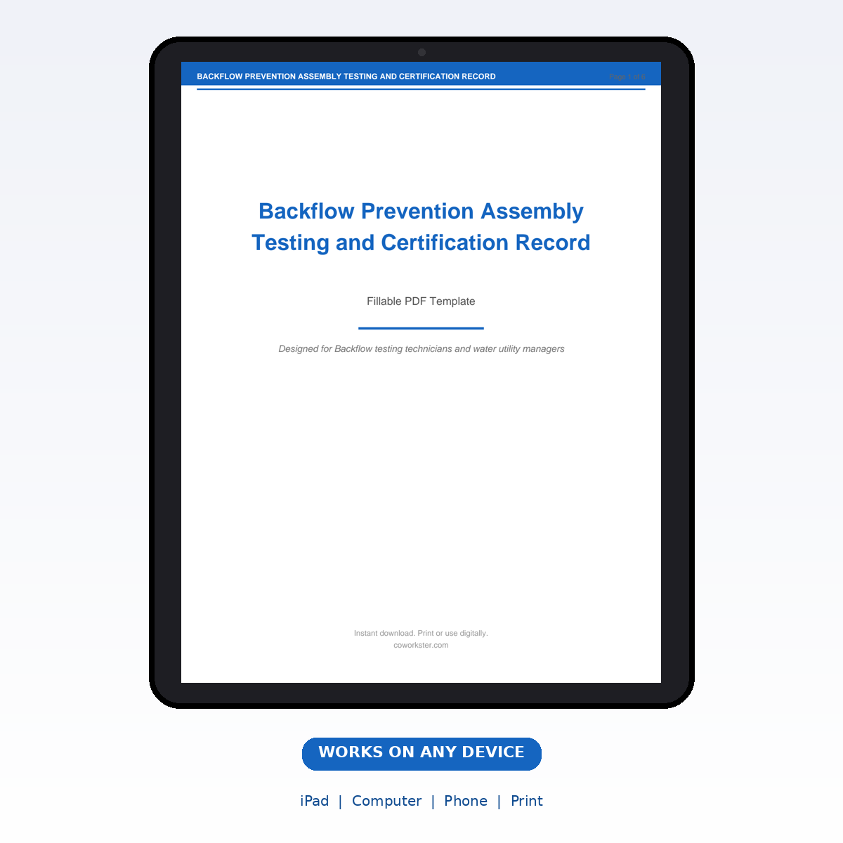 If you have been looking for a backflow prevention assembly testing and certification record that actually works the way you need it to, this is it. We designed this 6 page fillable PDF specifically for Backflow testing technicians and water utility managers who want something practical, organized, and ready to use right away.