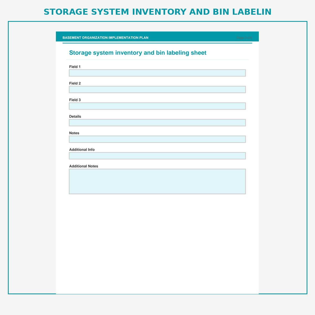 Storage system inventory and bin labeling sheet