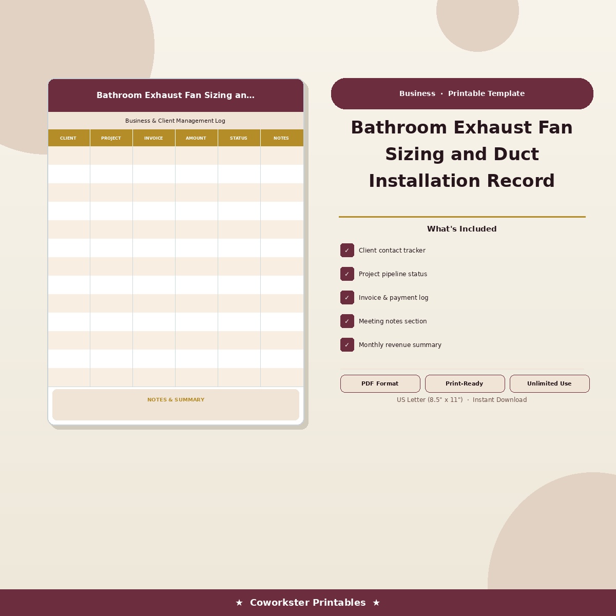 If you have been looking for a bathroom exhaust fan sizing and duct installation record that actually works the way you need it to, this is it. We designed this 5 page fillable PDF specifically for HVAC contractors and bathroom remodelers who want something practical, organized, and ready to use right away.