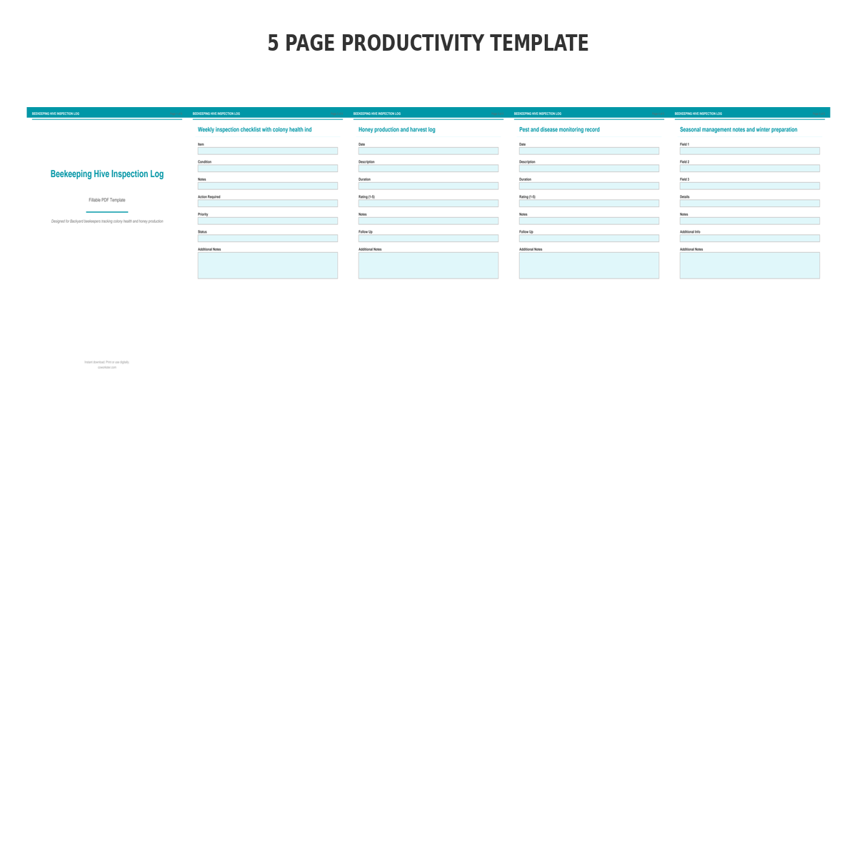 If you have been looking for a beekeeping hive inspection log that actually works the way you need it to, this is it. We designed this 5 page fillable PDF specifically for Backyard beekeepers tracking colony health and honey production who want something practical, organized, and ready to use right away.