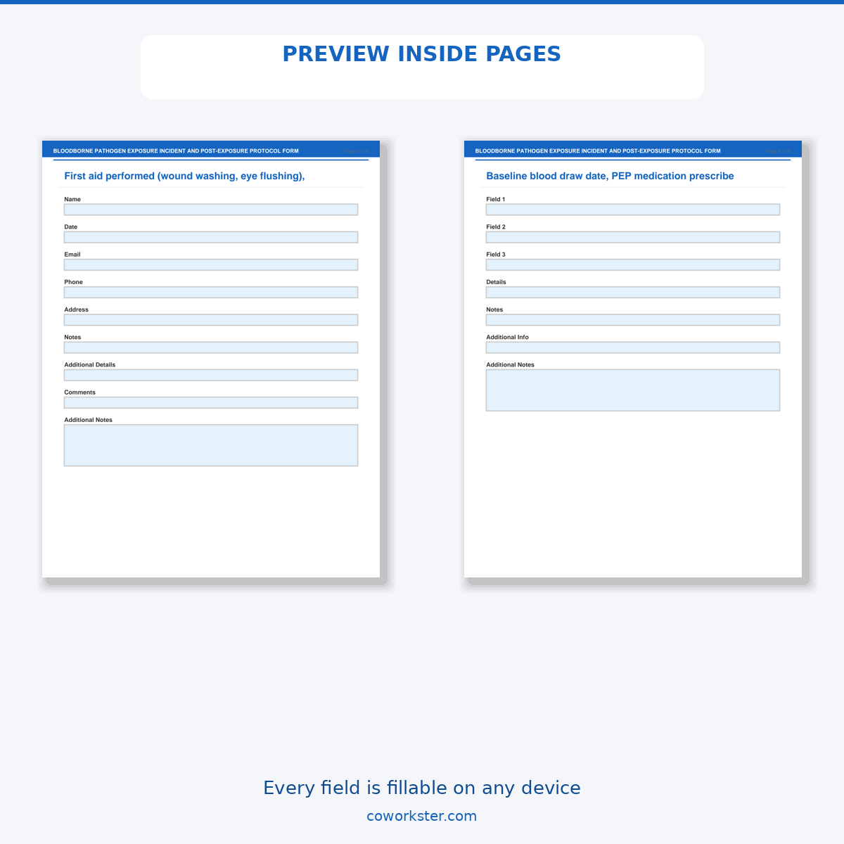 If you have been looking for a bloodborne pathogen exposure incident and post-exposure protocol form that actually works the way you need it to, this is it. We designed this 5 page fillable PDF specifically for Occupational health nurses and workplace safety managers who want something practical, organized, and ready to use right away.