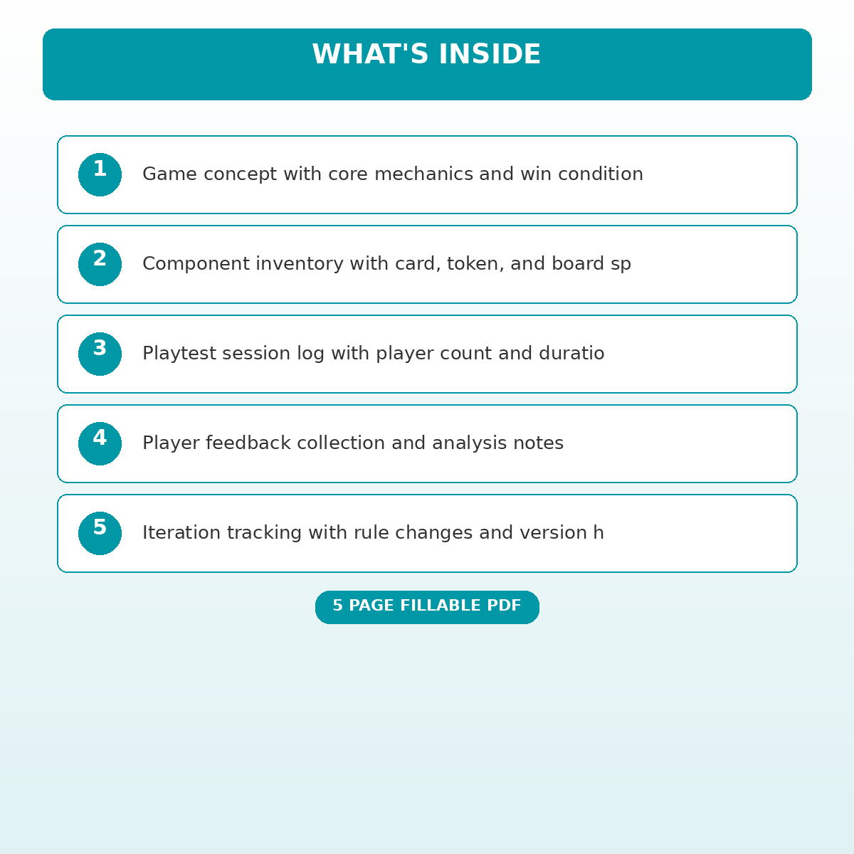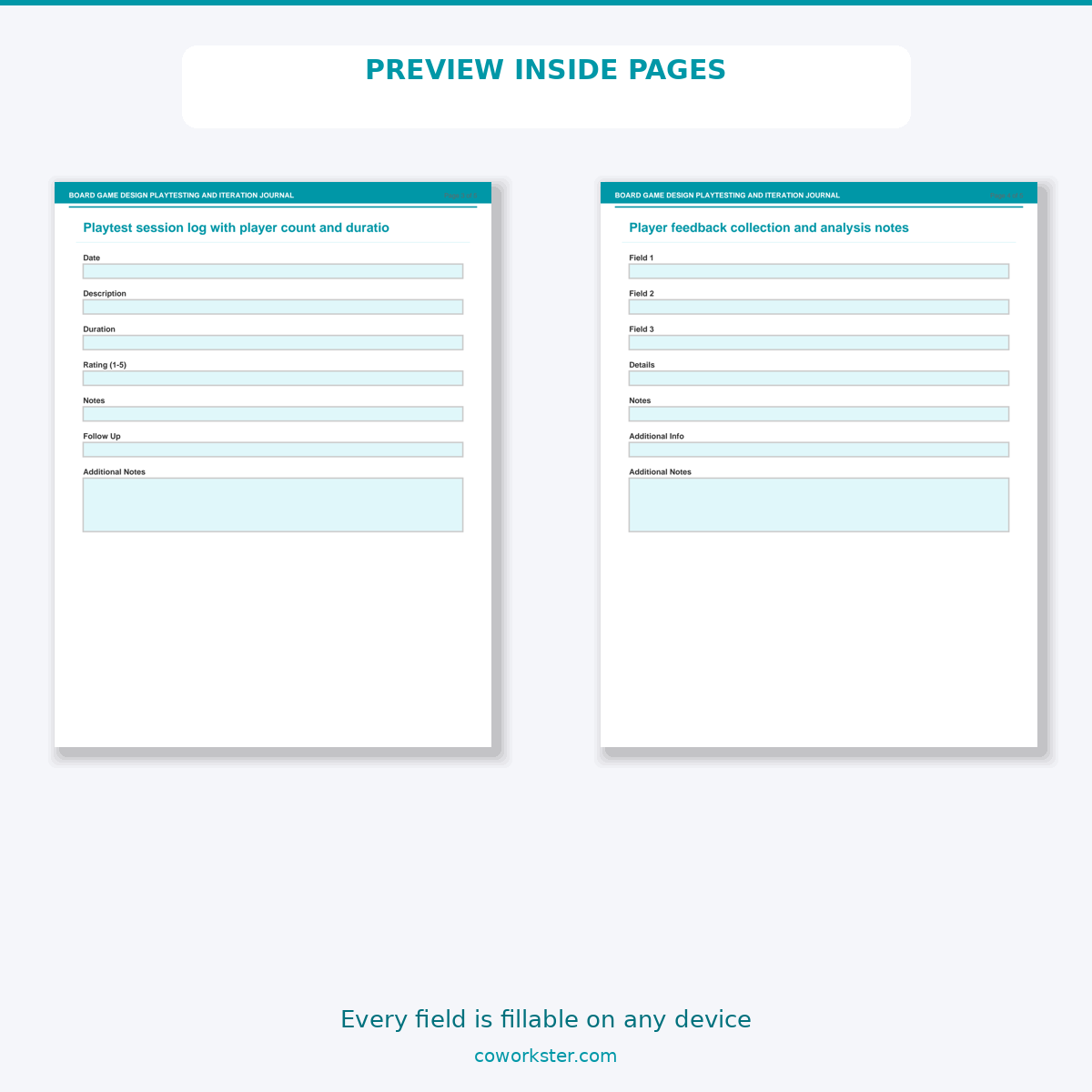A 5 page fillable PDF template designed for Board game designers documenting playtests and iterating game mechanics. Covers everything you need in one organized, professional document. Just open it, fill in the fields, and you are ready to go. Works on any device or print it out.