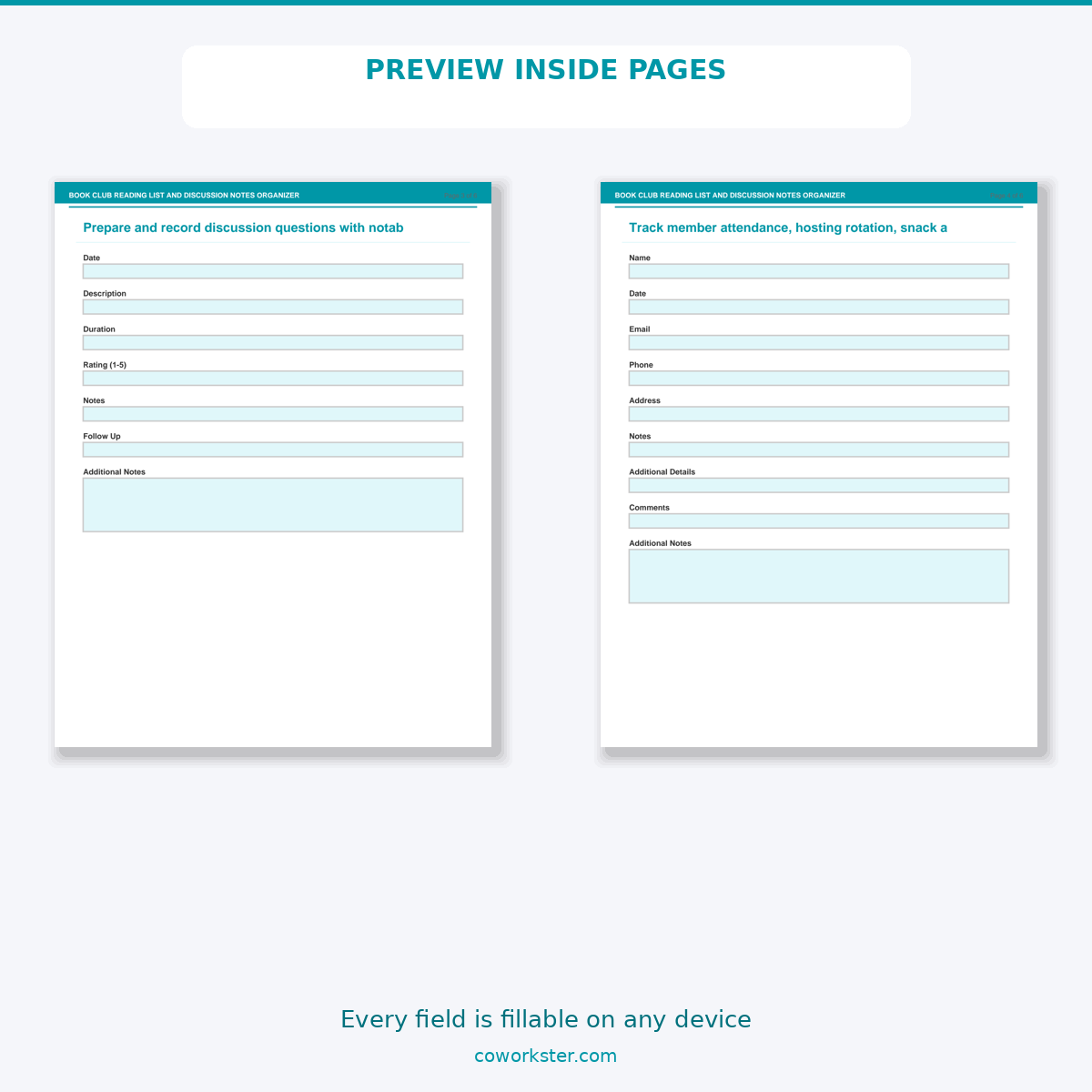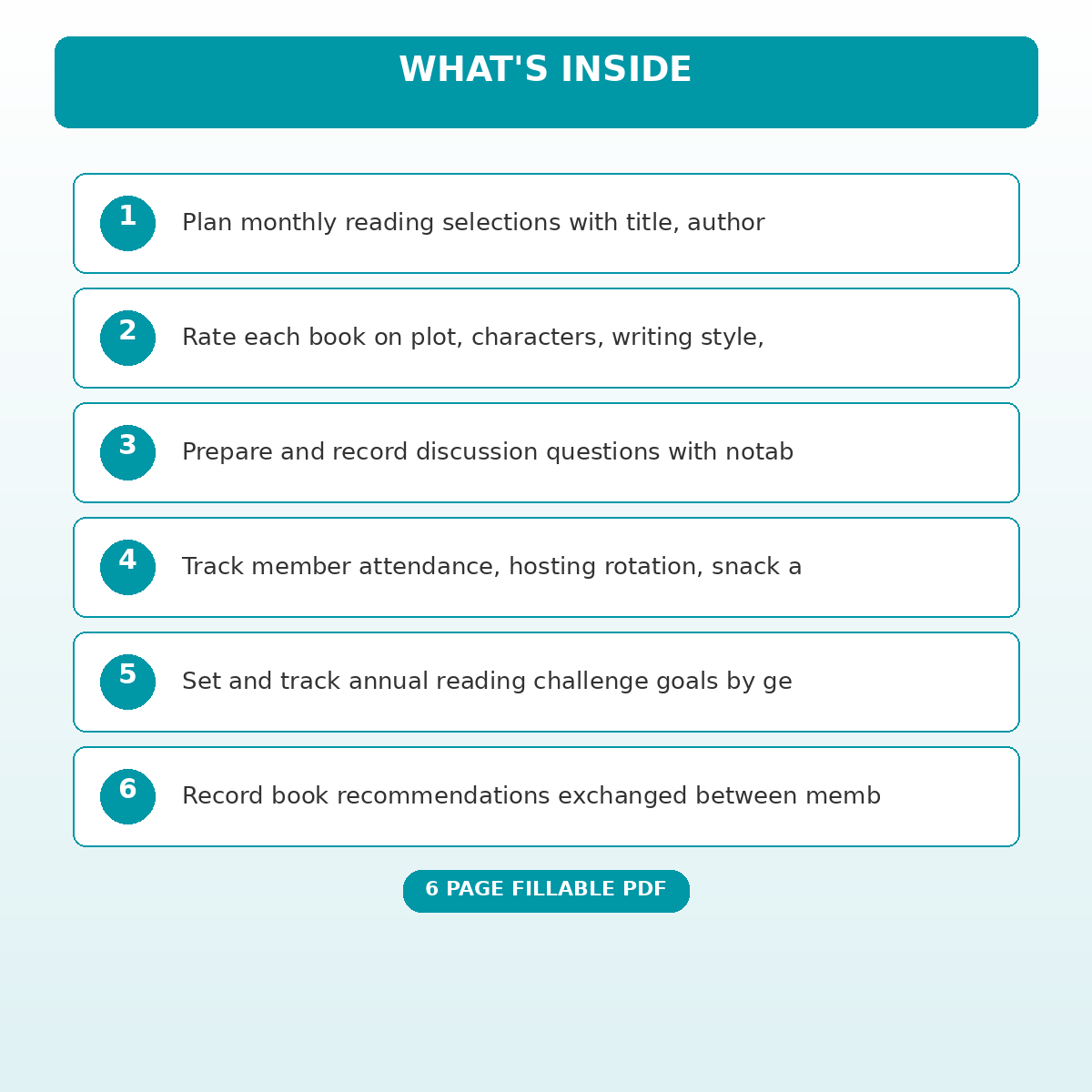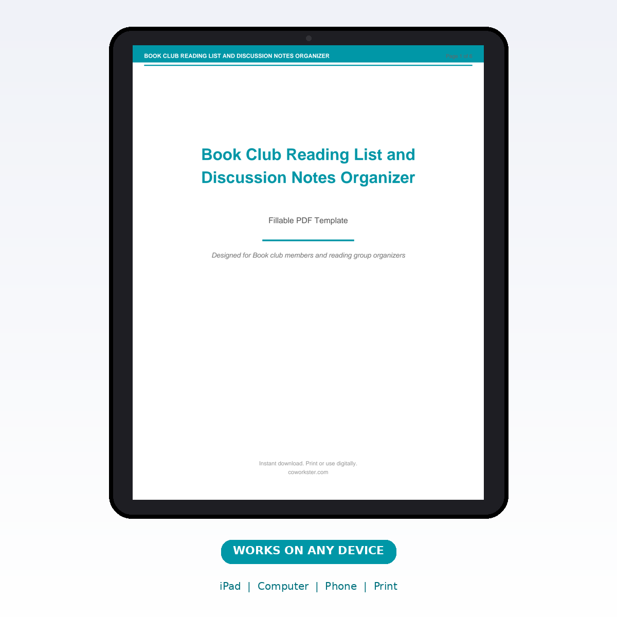 If you have been looking for a book club reading list and discussion notes organizer that actually works the way you need it to, this is it. We designed this 6 page fillable PDF specifically for Book club members and reading group organizers who want something practical, organized, and ready to use right away.