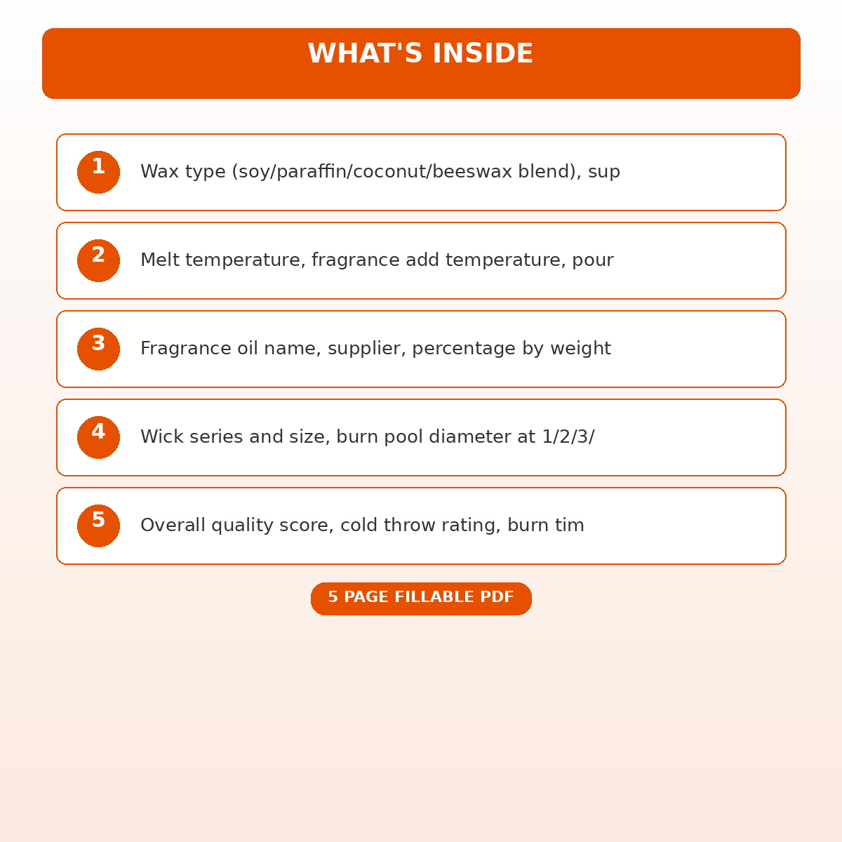 A 5 page fillable PDF template designed for Candle makers and small batch candle businesses. Covers everything you need in one organized, professional document. Just open it, fill in the fields, and you are ready to go. Works on any device or print it out.