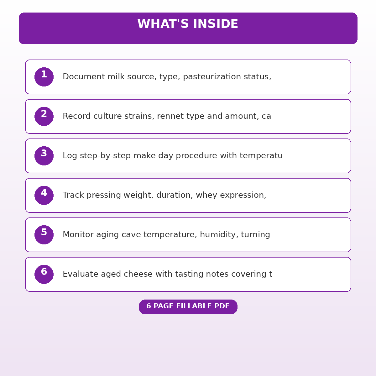 This template was built for Home cheese makers and artisan dairy enthusiasts. Whether you are just getting started or have been at it for years, having a proper system saves you time and keeps everything in one place. No more scattered notes, forgotten details, or reinventing the wheel every time.