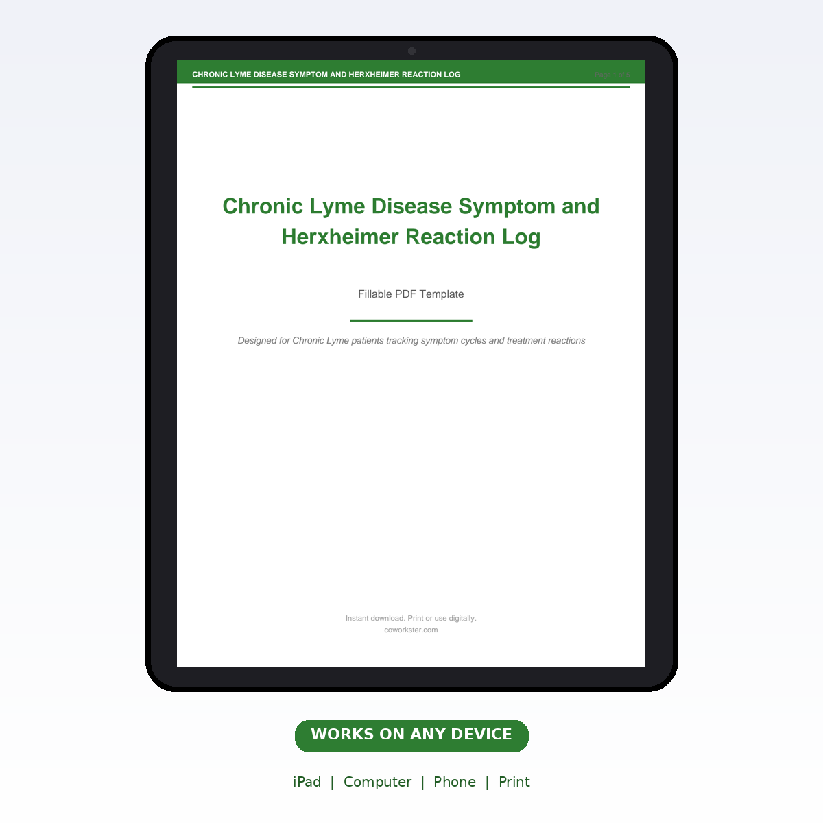 A 5 page fillable PDF template designed for Chronic Lyme patients tracking symptom cycles and treatment reactions. Covers everything you need in one organized, professional document. Just open it, fill in the fields, and you are ready to go. Works on any device or print it out.