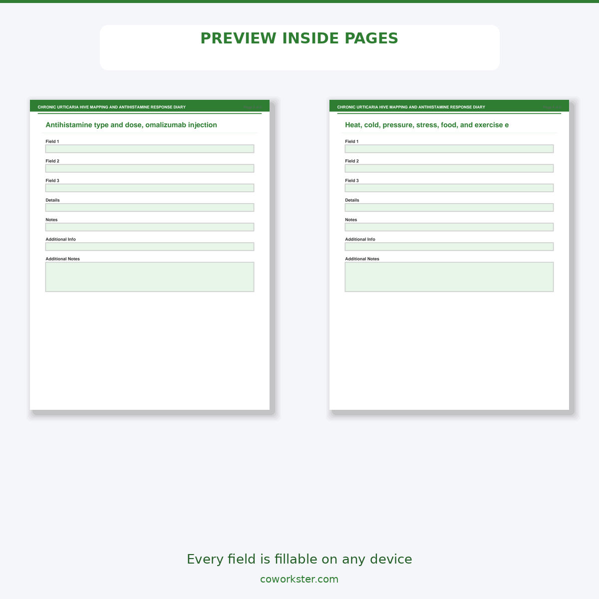 A 5 page fillable PDF template designed for Chronic hives patients and allergists/immunologists. Covers everything you need in one organized, professional document. Just open it, fill in the fields, and you are ready to go. Works on any device or print it out.