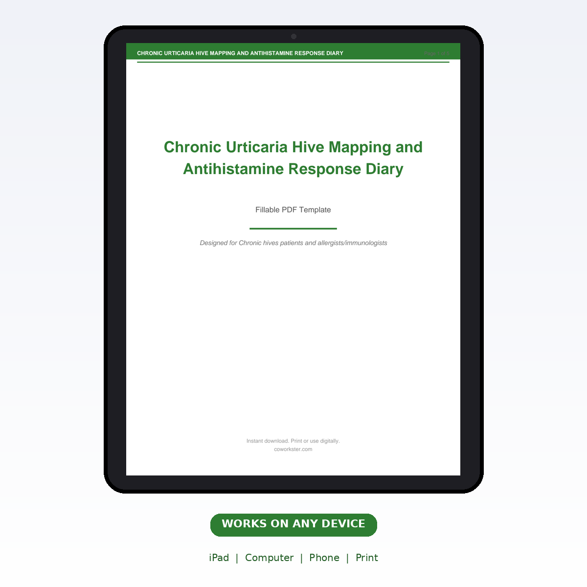 If you have been looking for a chronic urticaria hive mapping and antihistamine response diary that actually works the way you need it to, this is it. We designed this 5 page fillable PDF specifically for Chronic hives patients and allergists/immunologists who want something practical, organized, and ready to use right away.