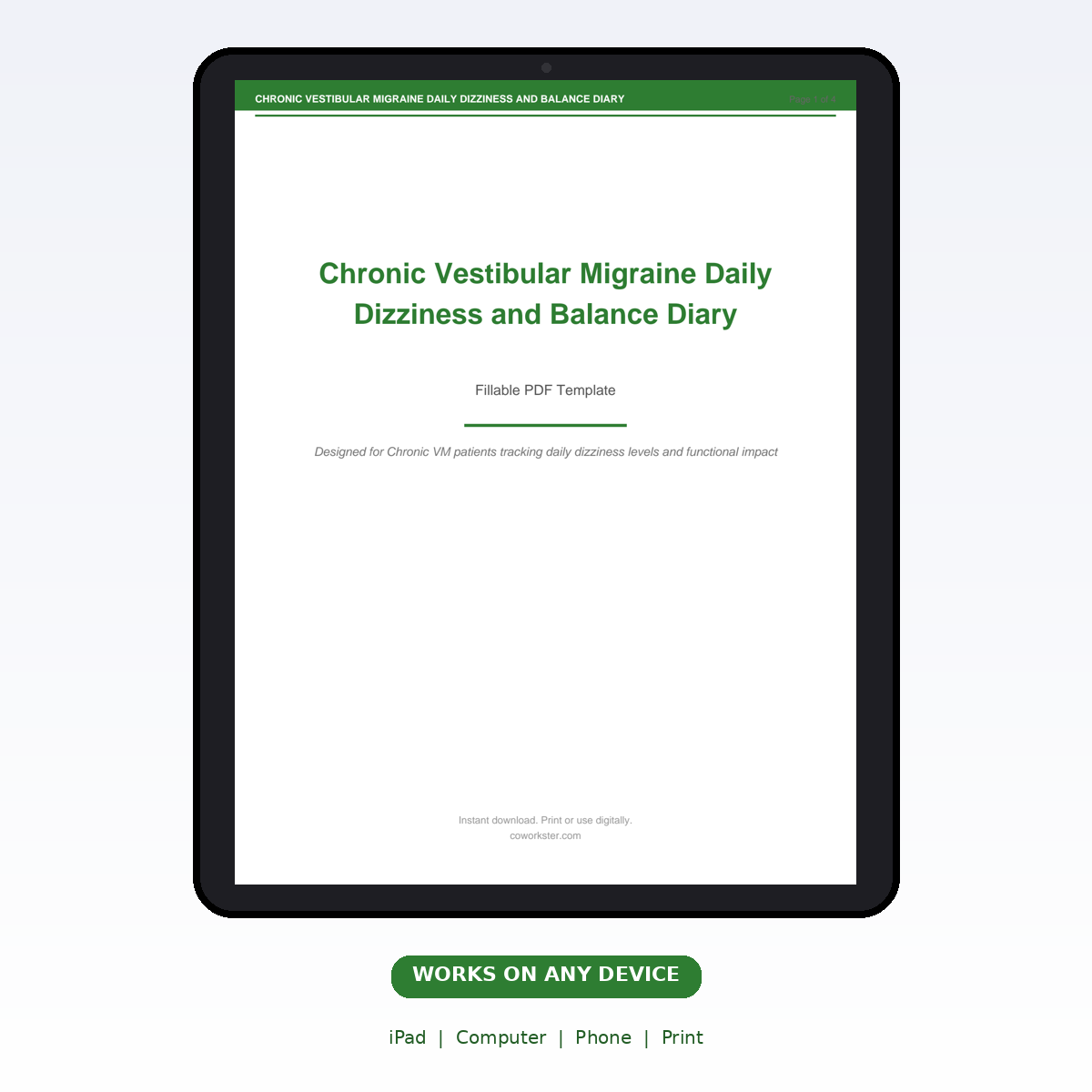 If you have been looking for a chronic vestibular migraine daily dizziness and balance diary that actually works the way you need it to, this is it. We designed this 4 page fillable PDF specifically for Chronic VM patients tracking daily dizziness levels and functional impact who want something practical, organized, and ready to use right away.