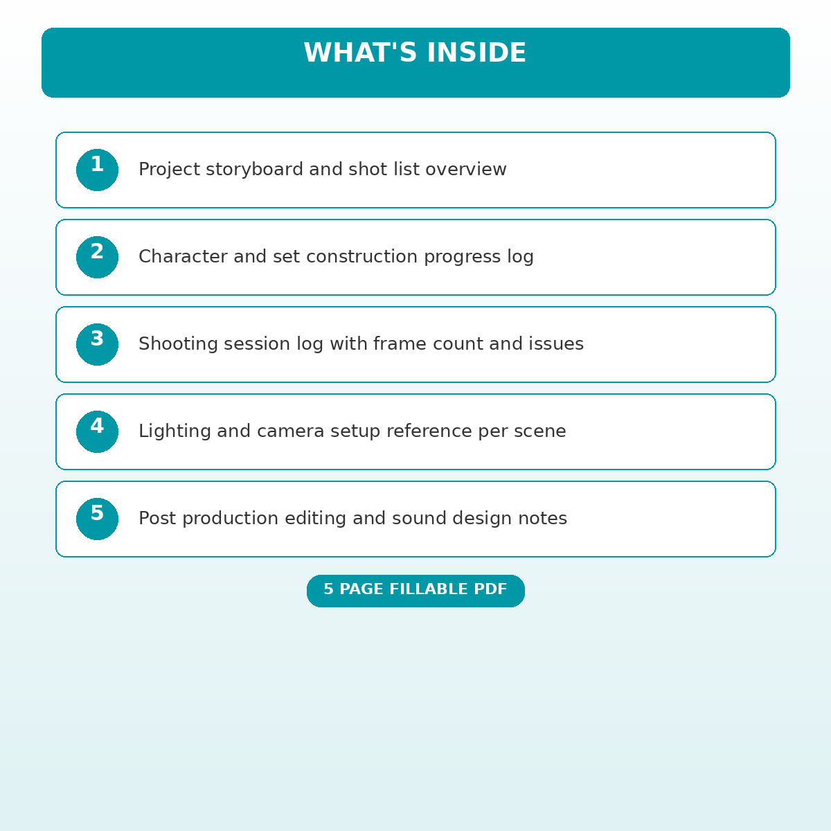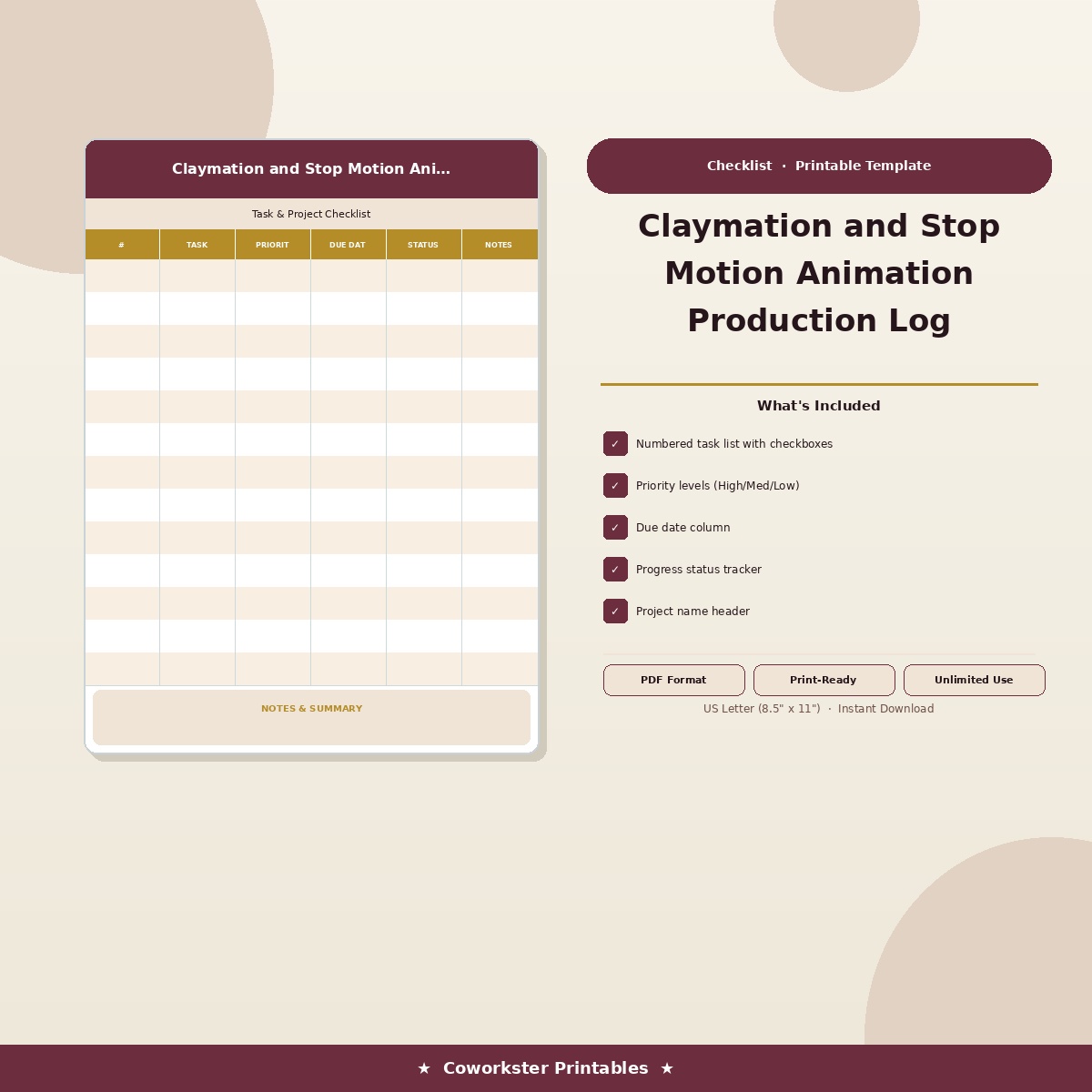 If you have been looking for a claymation and stop motion animation production log that actually works the way you need it to, this is it. We designed this 5 page fillable PDF specifically for Stop motion animators tracking production schedules and frame counts who want something practical, organized, and ready to use right away.