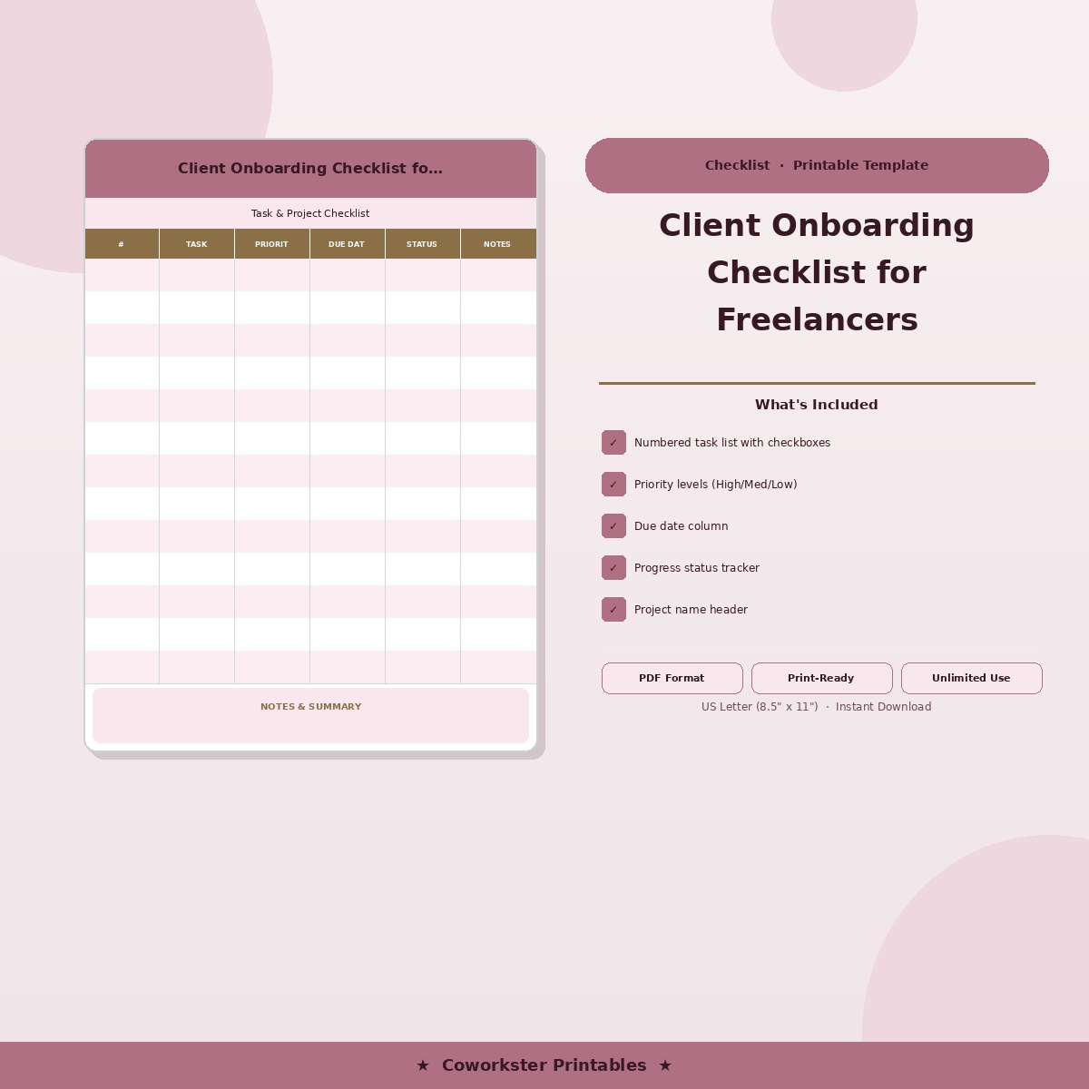 Streamline how you bring on new clients with this detailed onboarding checklist built for freelancers and solopreneurs. It covers everything from the initial inquiry and contract signing to project kickoff and follow-up. Each step includes a checkbox and a brief description of what to do, so nothing falls through the cracks. Print it out and keep it in your project folder, or fill it in digitally.
