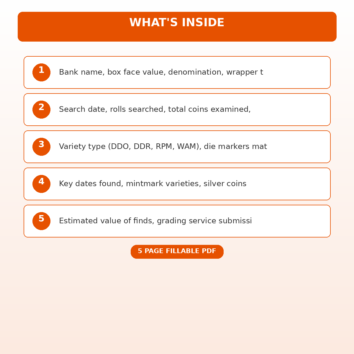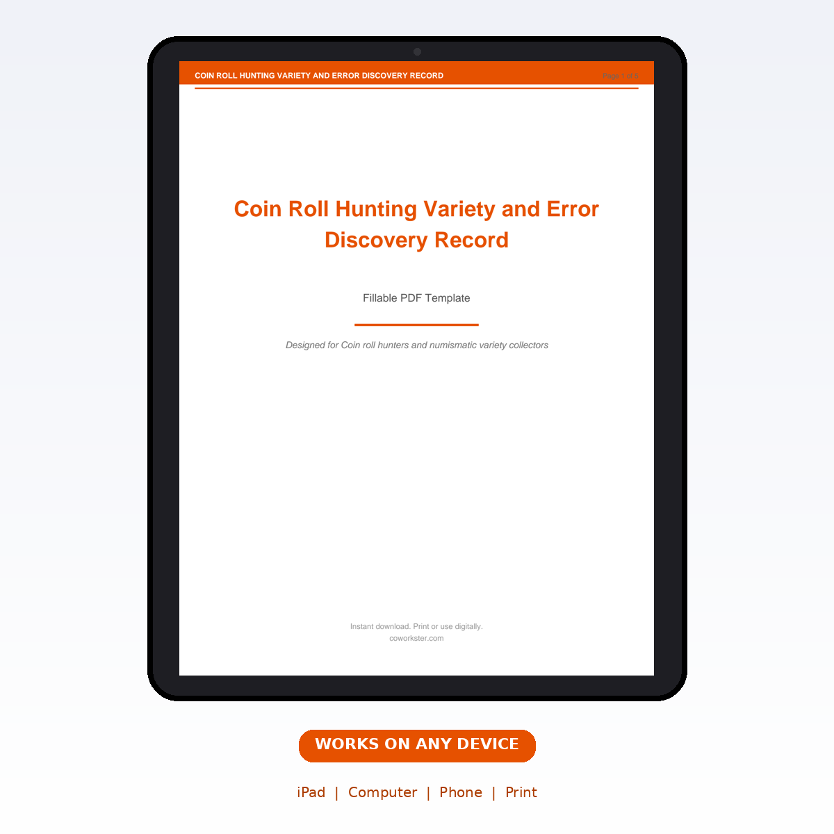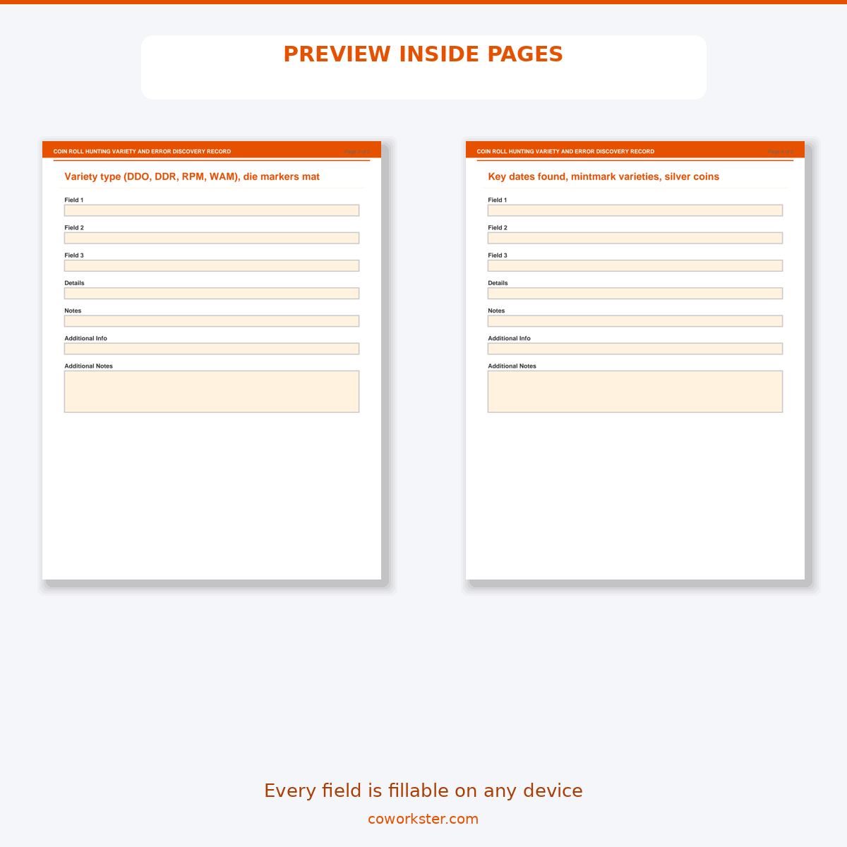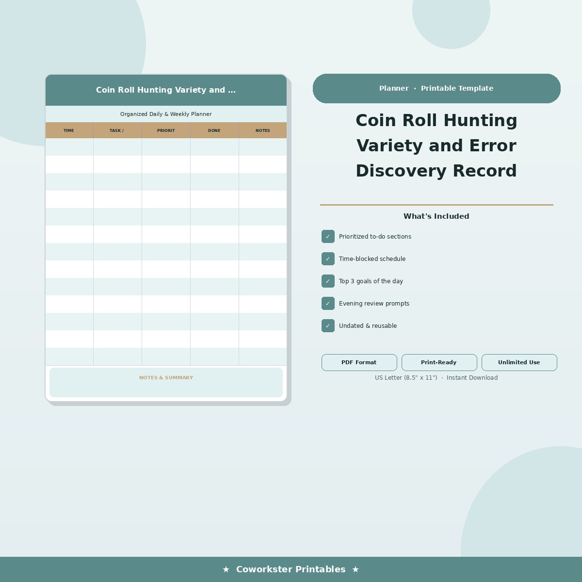 A [‘Bank Box and Roll Sourcing Record’, ‘Search Session Finds Log by Denomination’, ‘Variety and Error Identification Record’, ‘Key Date and Semi-Key Discovery Tracker’, ‘Collection Value and Submission Planning’] page fillable PDF template designed for Coin roll hunters and numismatic variety collectors. Covers everything you need in one organized, professional document. Just open it, fill in the fields, and you are ready to go. Works on any device or print it out.