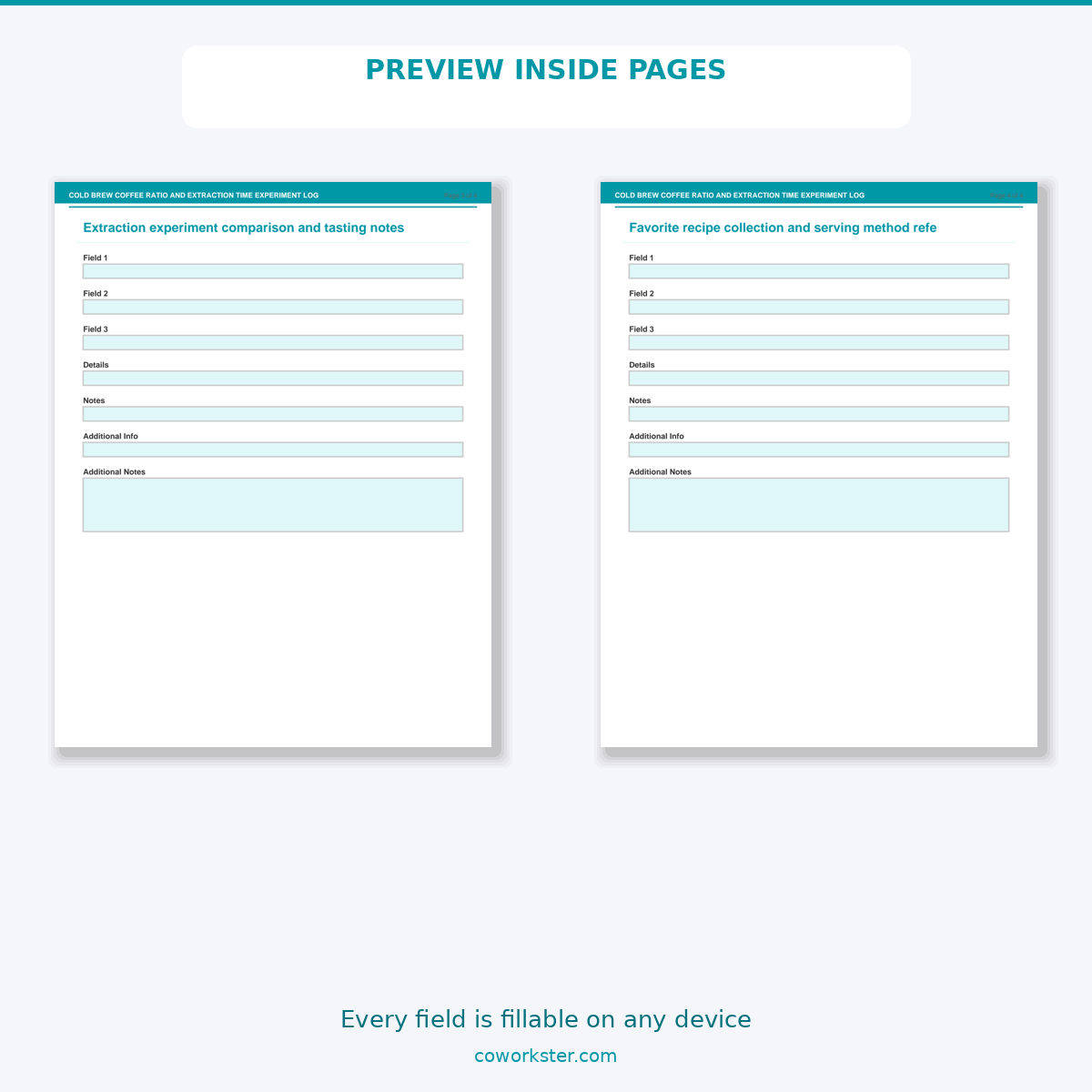 If you have been looking for a cold brew coffee ratio and extraction time experiment log that actually works the way you need it to, this is it. We designed this 4 page fillable PDF specifically for Cold brew enthusiasts experimenting with ratios and steep times who want something practical, organized, and ready to use right away.