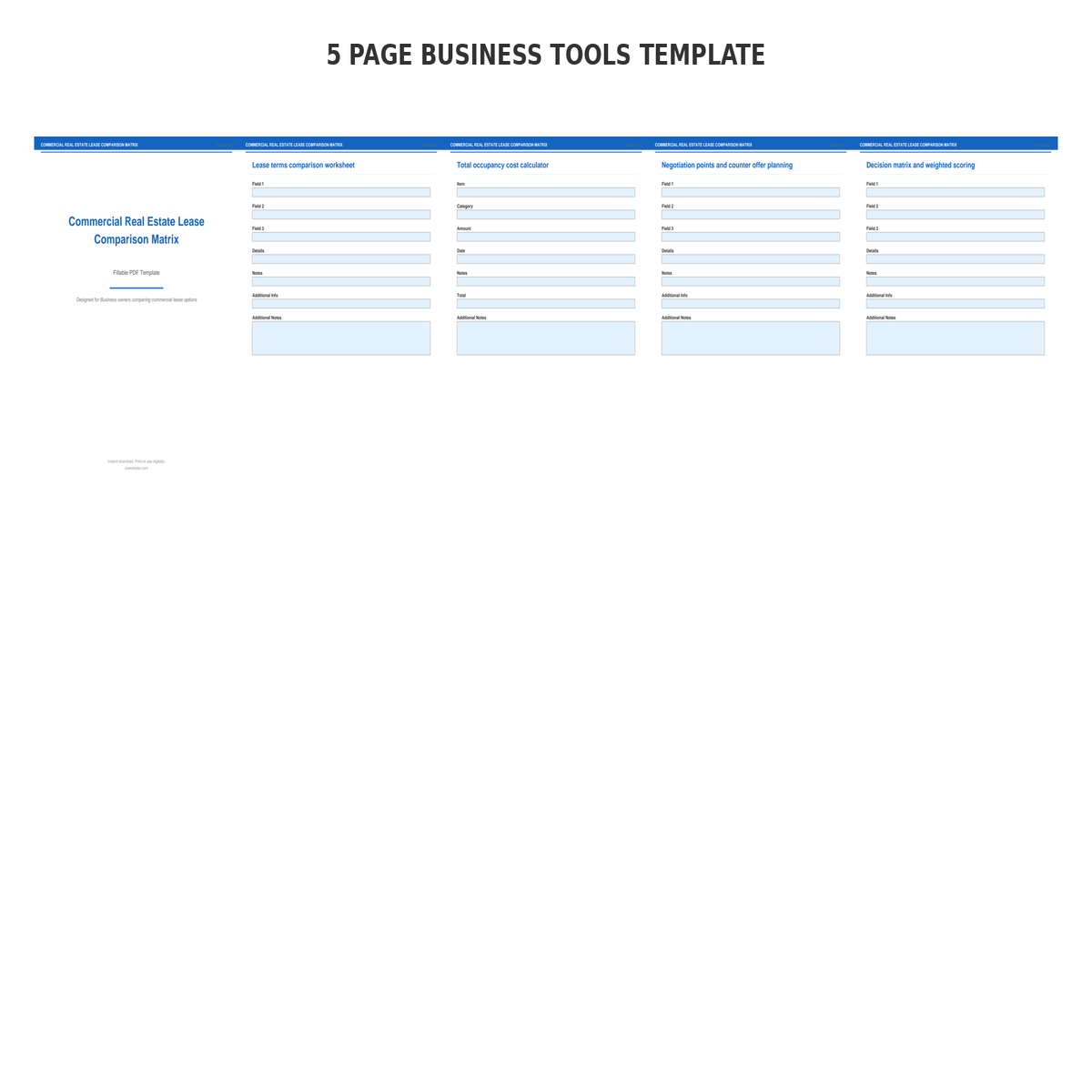 If you have been looking for a commercial real estate lease comparison matrix that actually works the way you need it to, this is it. We designed this 5 page fillable PDF specifically for Business owners comparing commercial lease options who want something practical, organized, and ready to use right away.