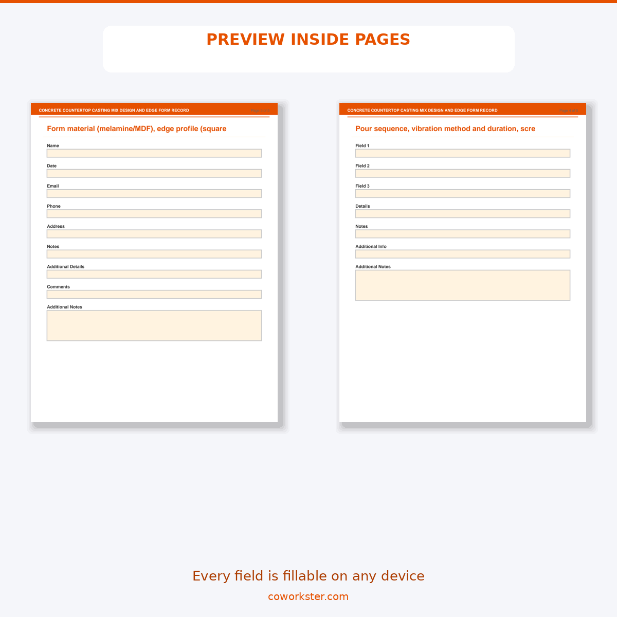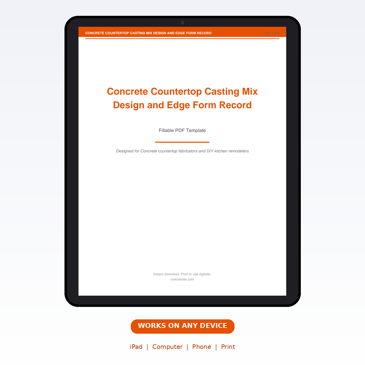 If you have been looking for a concrete countertop casting mix design and edge form record that actually works the way you need it to, this is it. We designed this 5 page fillable PDF specifically for Concrete countertop fabricators and DIY kitchen remodelers who want something practical, organized, and ready to use right away.