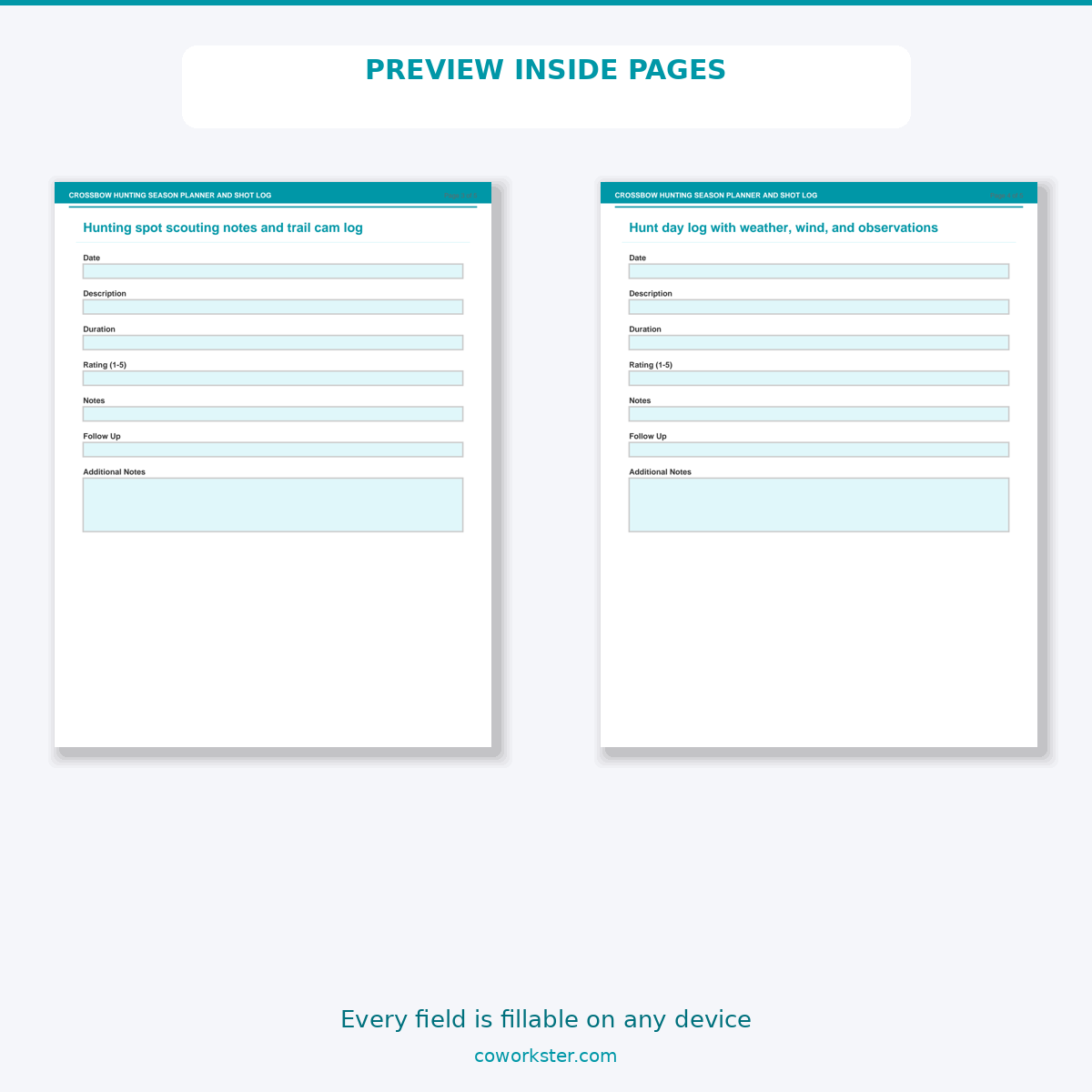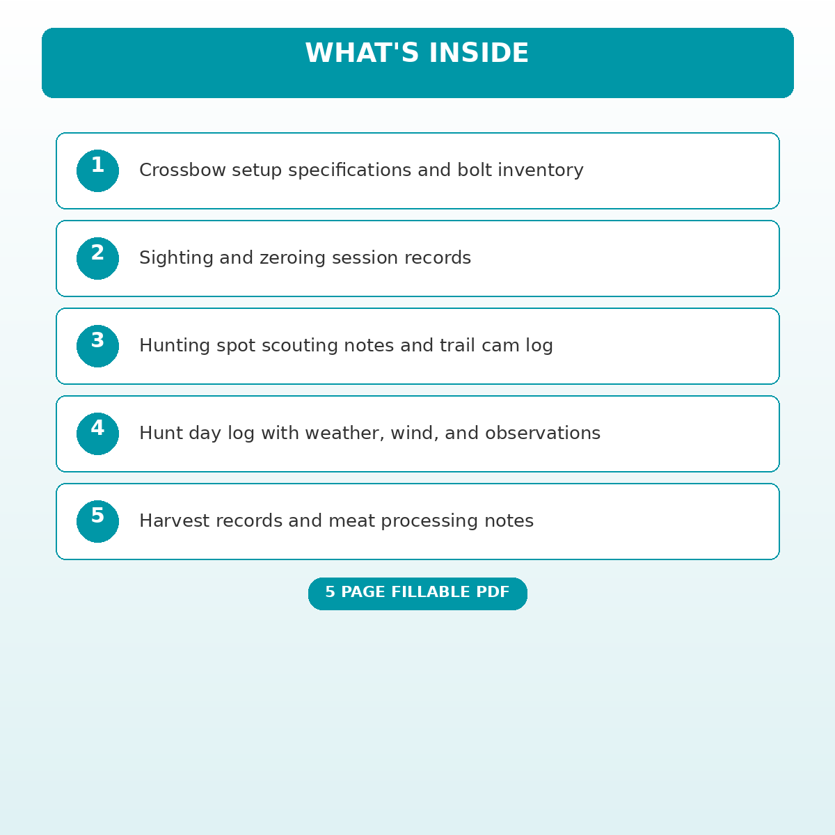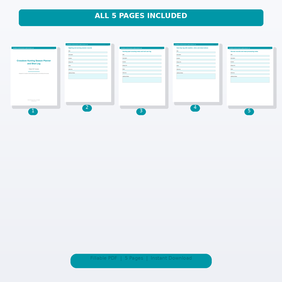If you have been looking for a crossbow hunting season planner and shot log that actually works the way you need it to, this is it. We designed this 5 page fillable PDF specifically for Crossbow hunters planning seasons and tracking shot accuracy who want something practical, organized, and ready to use right away.