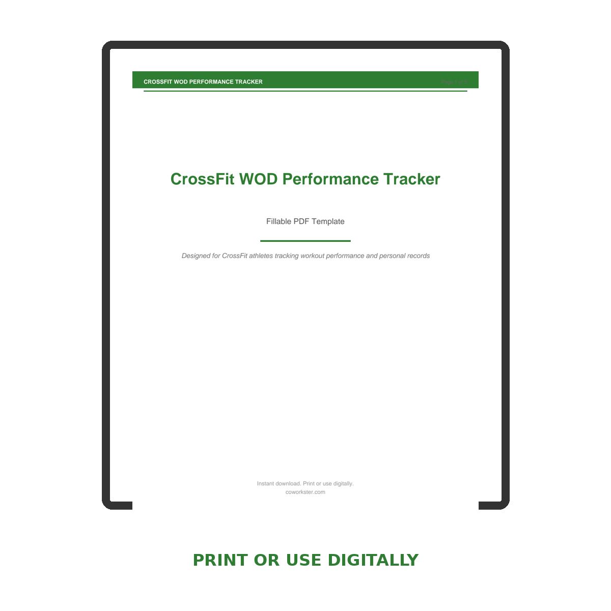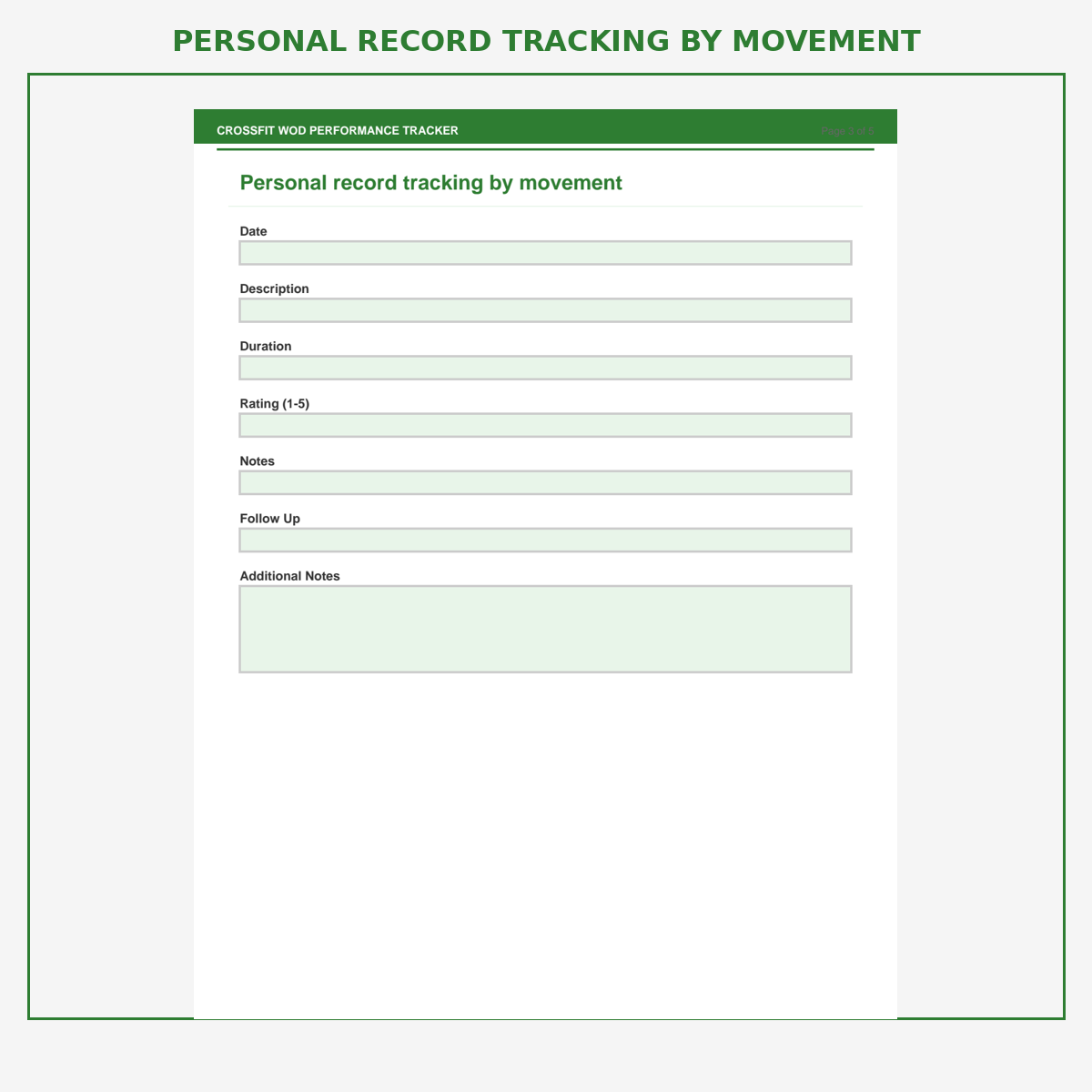 A 5 page fillable PDF template designed for CrossFit athletes tracking workout performance and personal records. Covers everything you need in one organized, professional document. Just open it, fill in the fields, and you are ready to go. Works on any device or print it out.