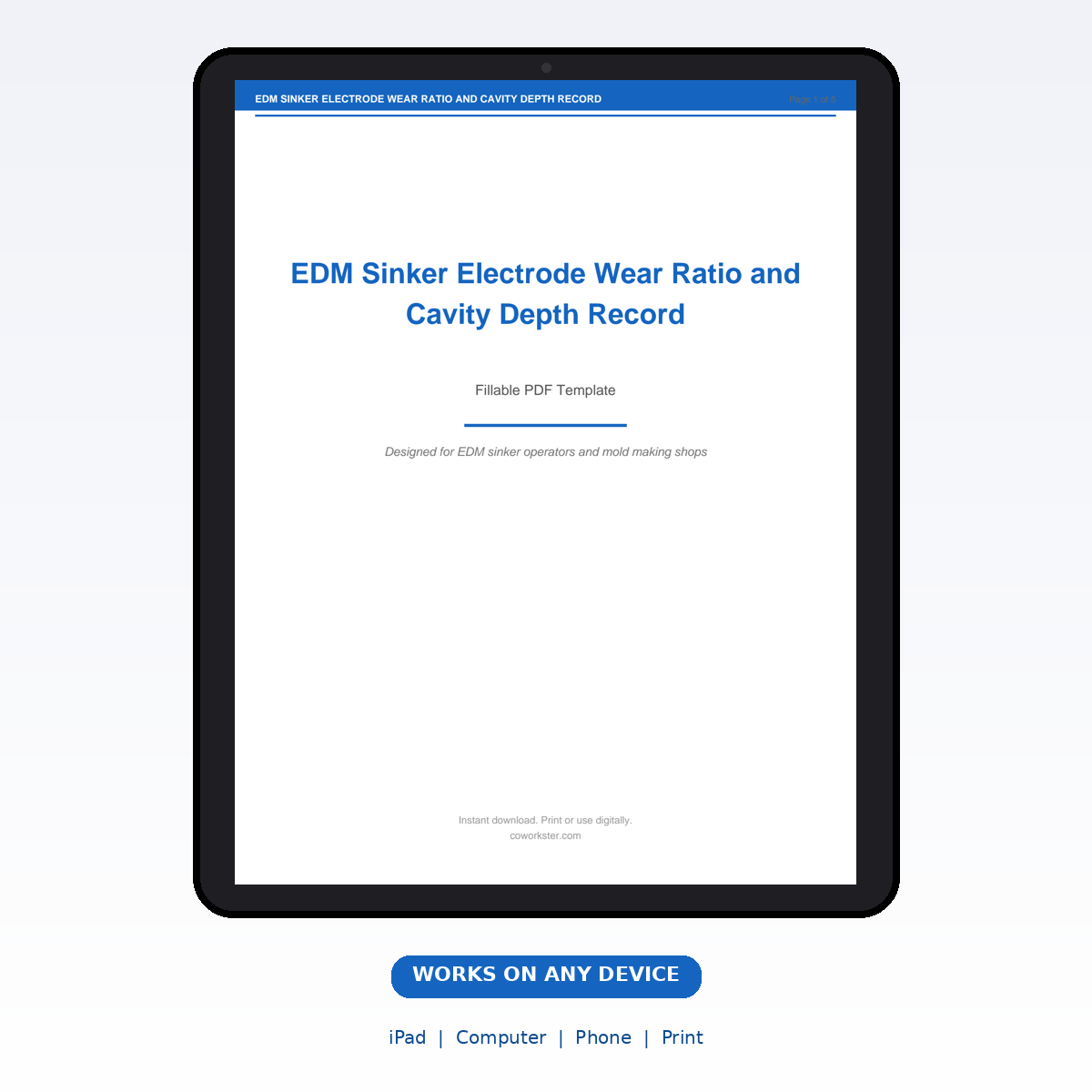 If you have been looking for a edm sinker electrode wear ratio and cavity depth record that actually works the way you need it to, this is it. We designed this 5 page fillable PDF specifically for EDM sinker operators and mold making shops who want something practical, organized, and ready to use right away.