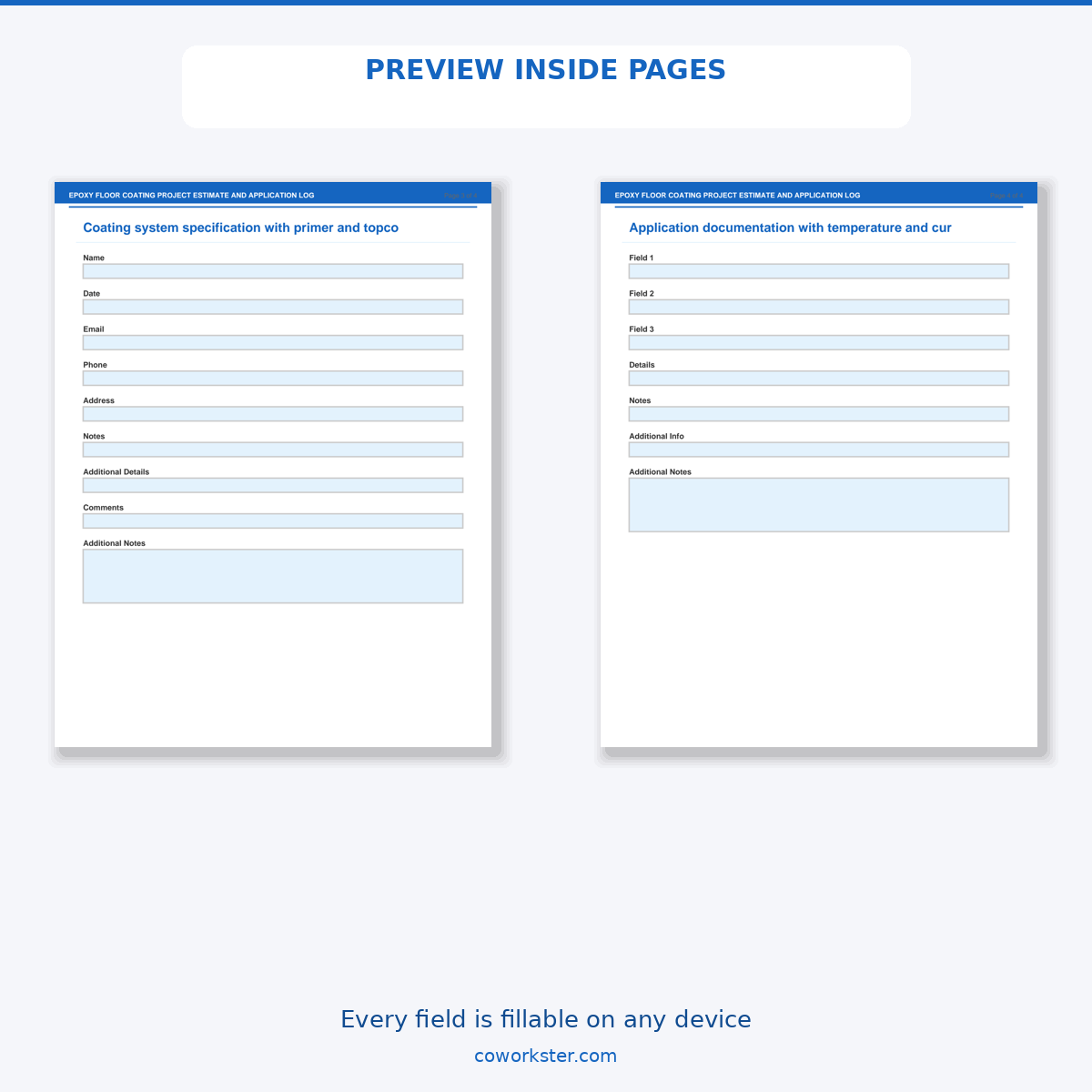This template was built for Epoxy flooring contractors documenting surface prep and coating application. Whether you are just getting started or have been at it for years, having a proper system saves you time and keeps everything in one place. No more scattered notes, forgotten details, or reinventing the wheel every time.