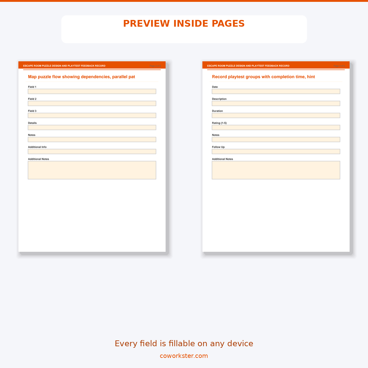 A [‘Room Theme and Storyline’, ‘Puzzle Design Documentation’, ‘Flow Chart and Dependencies’, ‘Playtest Session Record’, ‘Difficulty Calibration Notes’, ‘Final Room Specification’] page fillable PDF template designed for Escape room designers and puzzle game creators. Covers everything you need in one organized, professional document. Just open it, fill in the fields, and you are ready to go. Works on any device or print it out.