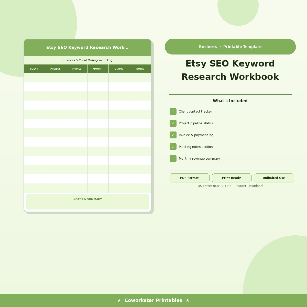 This template was built for Etsy sellers optimizing listings with keyword research. Whether you are just getting started or have been at it for years, having a proper system saves you time and keeps everything in one place. No more scattered notes, forgotten details, or reinventing the wheel every time.