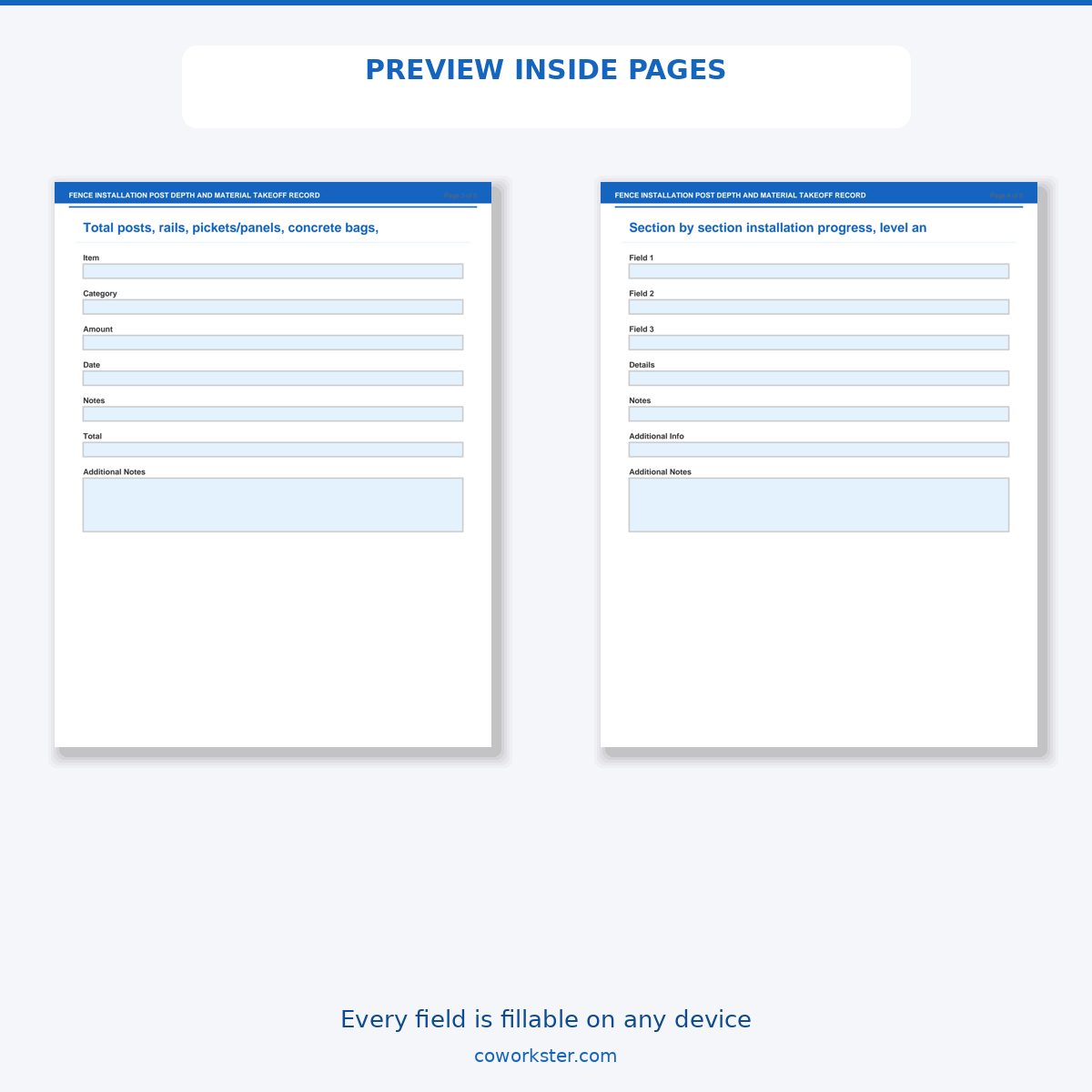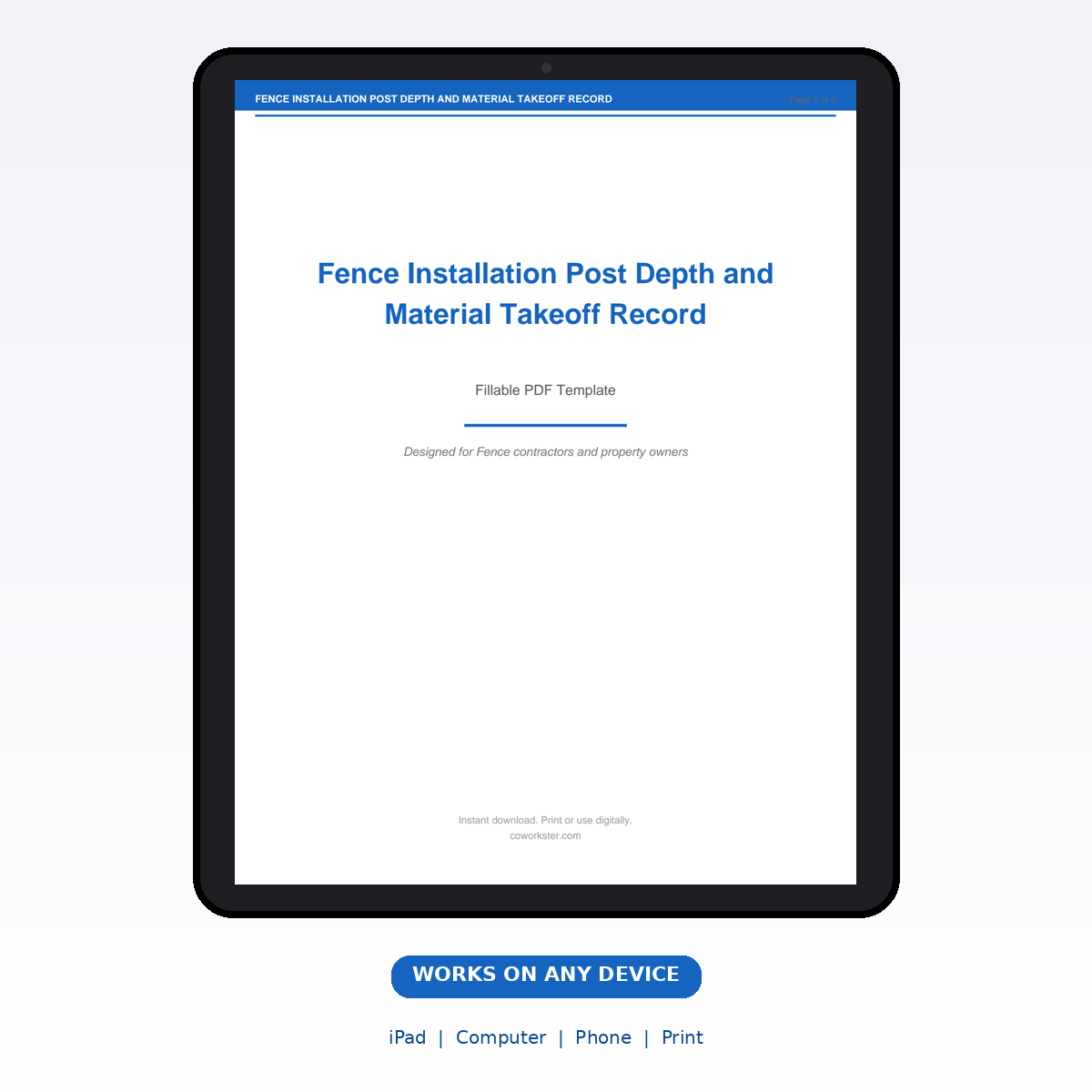 If you have been looking for a fence installation post depth and material takeoff record that actually works the way you need it to, this is it. We designed this 5 page fillable PDF specifically for Fence contractors and property owners who want something practical, organized, and ready to use right away.