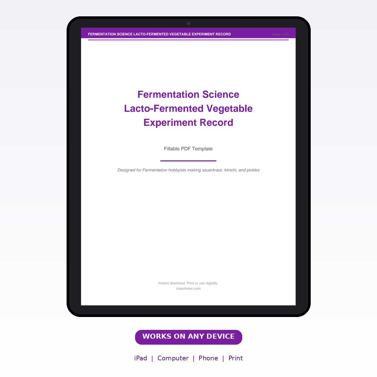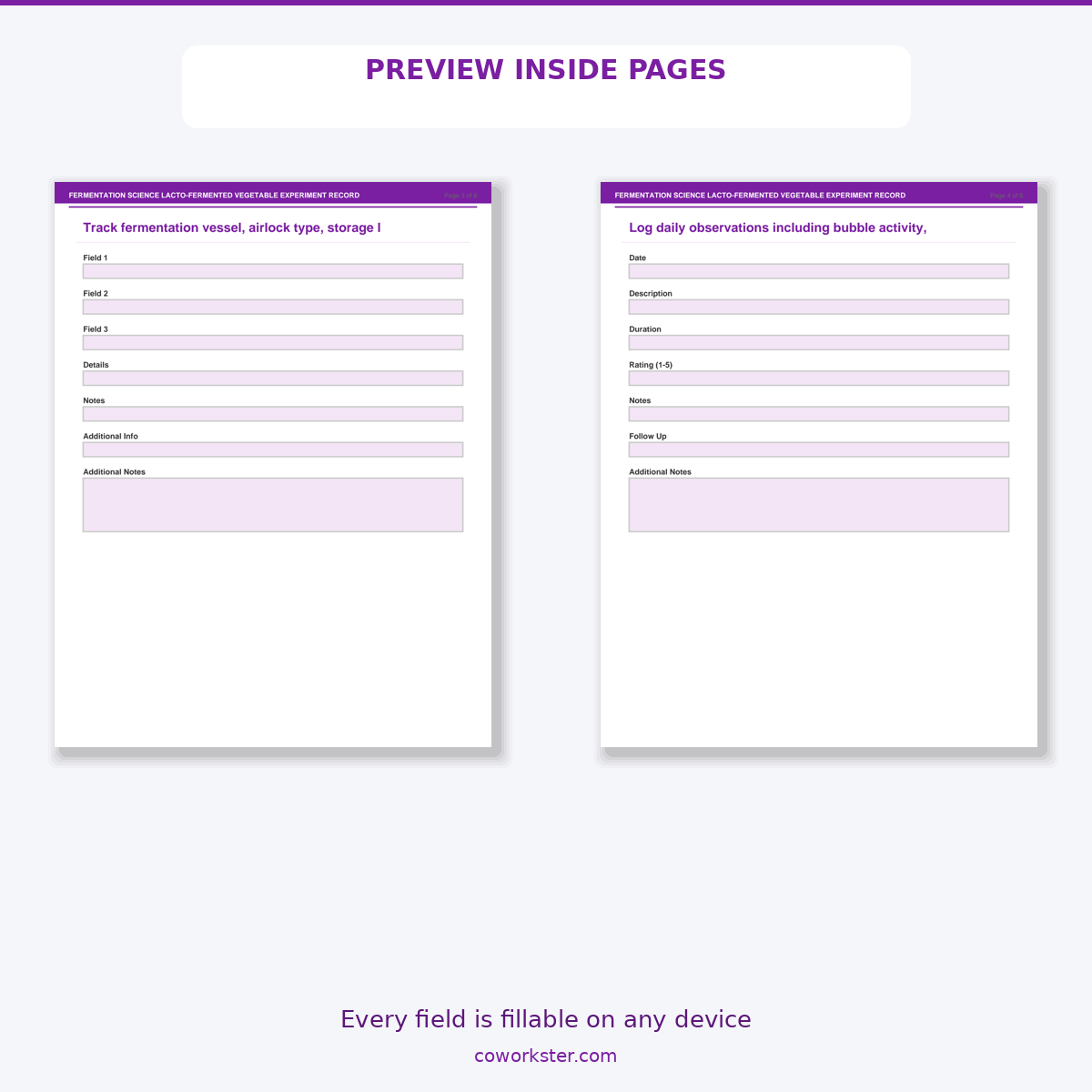A [‘Vegetable Preparation Record’, ‘Salt Brine Calculation’, ‘Fermentation Environment Log’, ‘Daily Observation Journal’, ‘Tasting and pH Record’, ‘Recipe Perfection Notes’] page fillable PDF template designed for Fermentation hobbyists making sauerkraut, kimchi, and pickles. Covers everything you need in one organized, professional document. Just open it, fill in the fields, and you are ready to go. Works on any device or print it out.