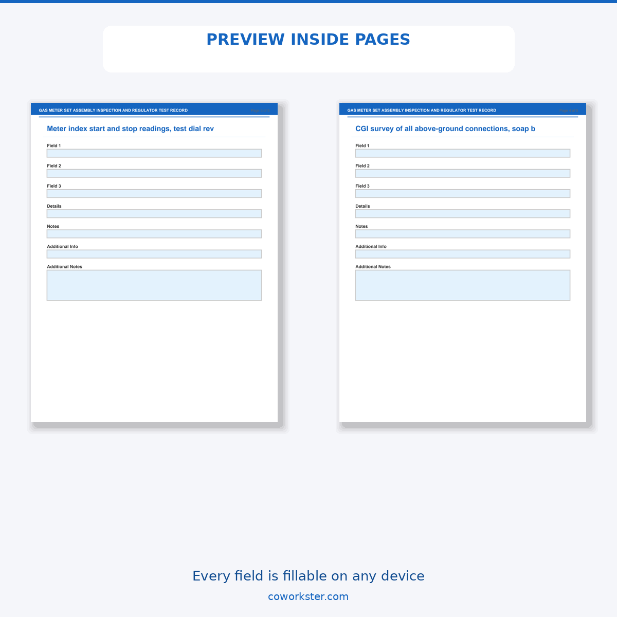 A 5-page fillable PDF covering Meter Set Location and Component Identification, Regulator Lock-Up and Creep Test Procedure, Meter Index Reading and Accuracy Verification, Leak Survey with Combustible Gas Indicator, and Service Line Condition Assessment and Documentation template designed for Gas utility technicians and plumbing inspectors. Covers everything you need in one organized, professional document. Just open it, fill in the fields, and you are ready to go. Works on any device or print it out.