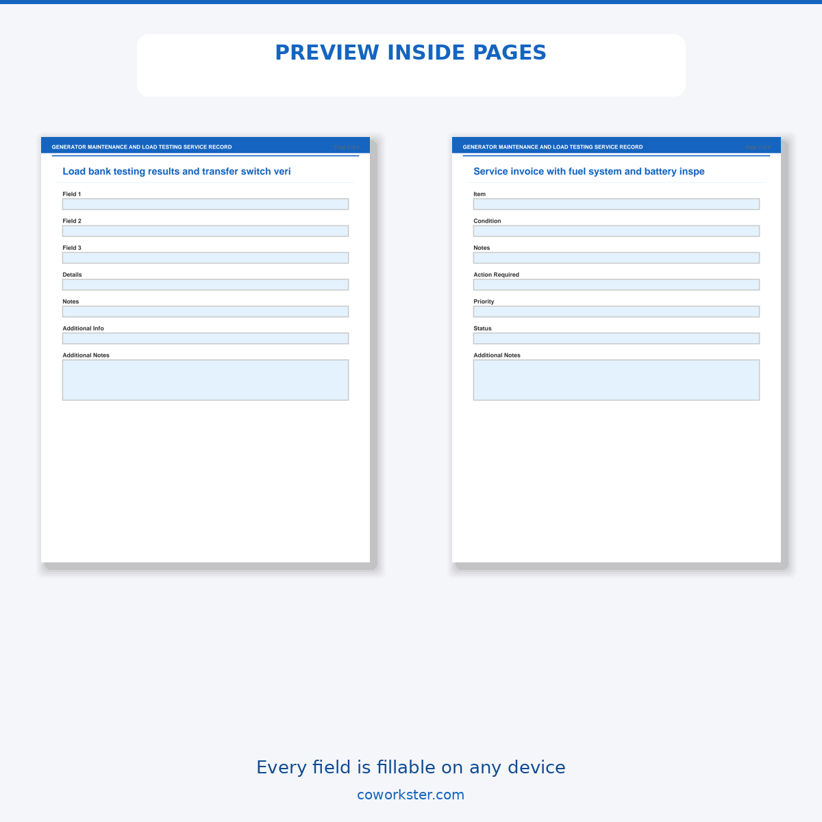 If you have been looking for a generator maintenance and load testing service record that actually works the way you need it to, this is it. We designed this 4 page fillable PDF specifically for Generator service technicians documenting maintenance and load tests who want something practical, organized, and ready to use right away.