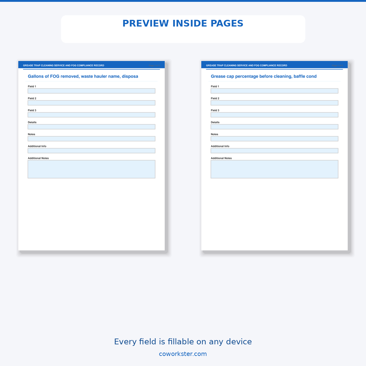 If you have been looking for a grease trap cleaning service and fog compliance record that actually works the way you need it to, this is it. We designed this 5 page fillable PDF specifically for Restaurant grease trap service companies and health inspectors who want something practical, organized, and ready to use right away.