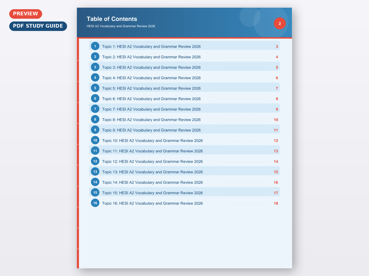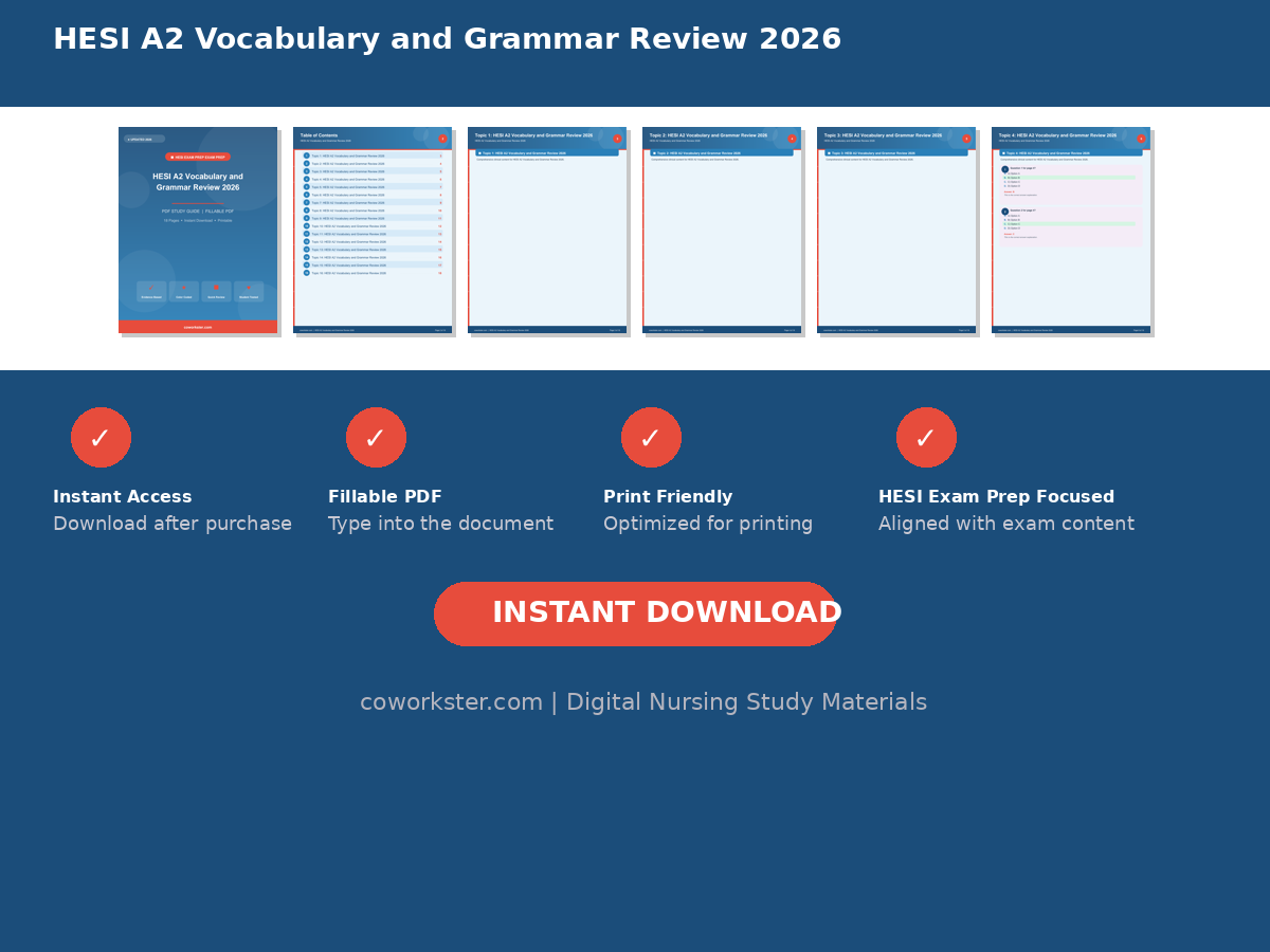 This digital download includes 18 professionally designed pages covering Topic 1: HESI A2 Vocabulary and Grammar Review 2026, Topic 2: HESI A2 Vocabulary and Grammar Review 2026, Topic 3: HESI A2 Vocabulary and Grammar Review 2026, Topic 4: HESI A2 Vocabulary and Grammar Review 2026, Topic 5: HESI A2 Vocabulary and Grammar Review 2026, Topic 6: HESI A2 Vocabulary and Grammar Review 2026, Topic 7: HESI A2 Vocabulary and Grammar Review 2026, Topic 8: HESI A2 Vocabulary and Grammar Review 2026, Topic 9: HESI A2 Vocabulary and Grammar Review 2026, Topic 10: HESI A2 Vocabulary and Grammar Review 2026, Topic 11: HESI A2 Vocabulary and Grammar Review 2026, Topic 12: HESI A2 Vocabulary and Grammar Review 2026, Topic 13: HESI A2 Vocabulary and Grammar Review 2026, Topic 14: HESI A2 Vocabulary and Grammar Review 2026, Topic 15: HESI A2 Vocabulary and Grammar Review 2026, and Topic 16: HESI A2 Vocabulary and Grammar Review 2026. Every page features a clean, color coded layout that makes complex nursing concepts easy to scan and review. The fillable PDF format means you can type directly into the document on your computer, tablet, or phone, or print it out and write by hand. Either way, you have a study tool that works the way you study.