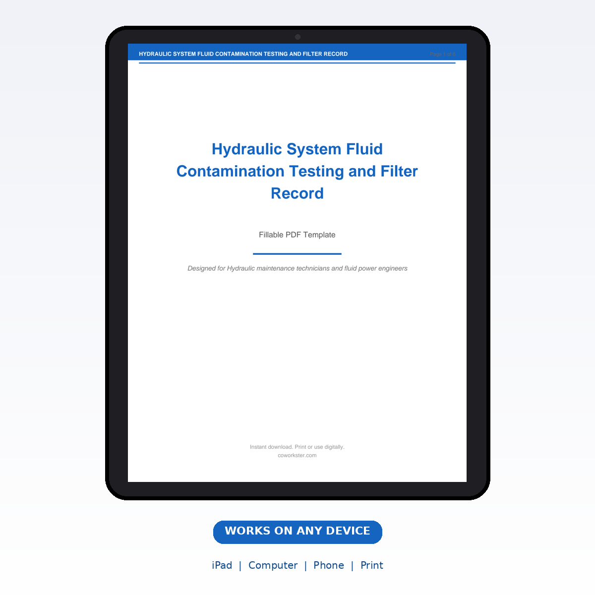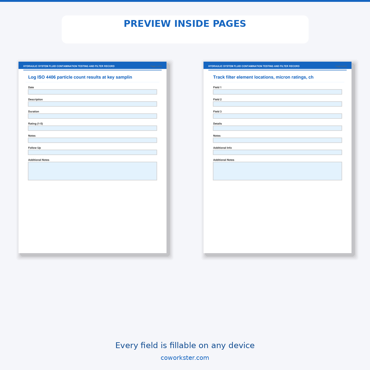 If you have been looking for a hydraulic system fluid contamination testing and filter record that actually works the way you need it to, this is it. We designed this 6 page fillable PDF specifically for Hydraulic maintenance technicians and fluid power engineers who want something practical, organized, and ready to use right away.