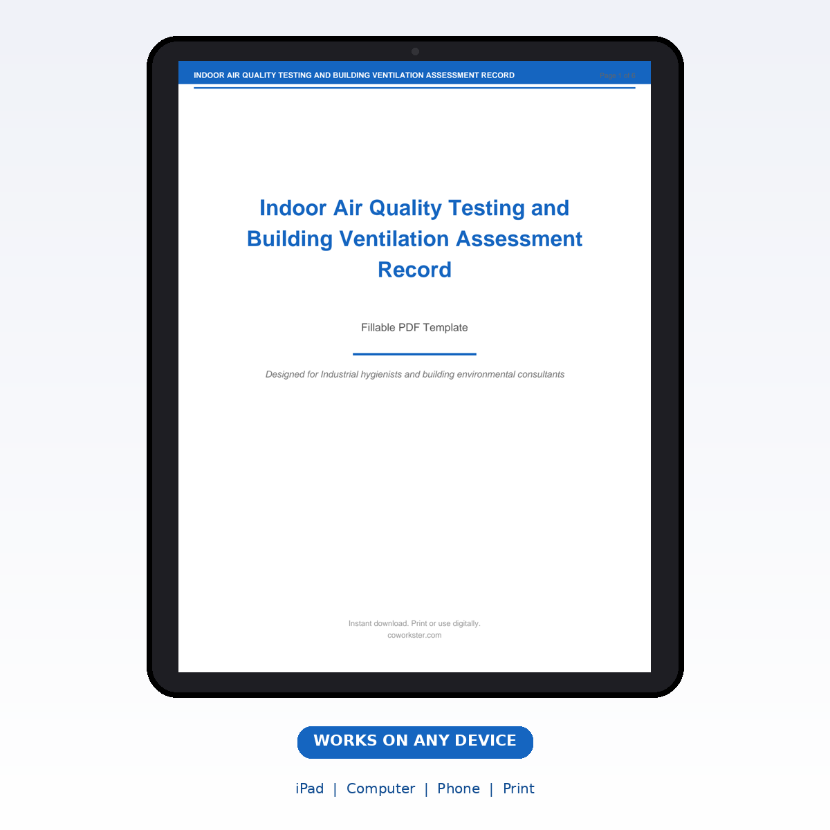 If you have been looking for a indoor air quality testing and building ventilation assessment record that actually works the way you need it to, this is it. We designed this 6 page fillable PDF specifically for Industrial hygienists and building environmental consultants who want something practical, organized, and ready to use right away.