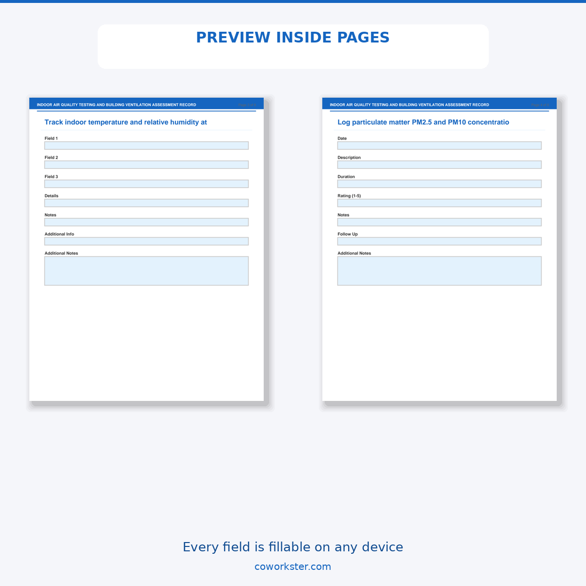 A [‘Building System Overview’, ‘CO2 Monitoring Record’, ‘Temperature and Humidity Log’, ‘Particulate Matter Testing’, ‘VOC Sampling Results’, ‘Ventilation Rate Assessment’] page fillable PDF template designed for Industrial hygienists and building environmental consultants. Covers everything you need in one organized, professional document. Just open it, fill in the fields, and you are ready to go. Works on any device or print it out.