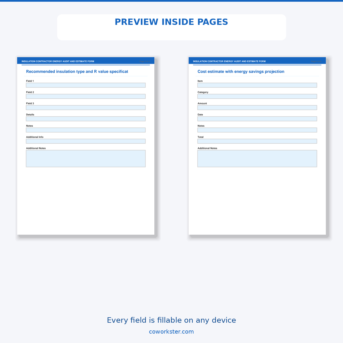 If you have been looking for a insulation contractor energy audit and estimate form that actually works the way you need it to, this is it. We designed this 4 page fillable PDF specifically for Insulation contractors documenting energy audits and project estimates who want something practical, organized, and ready to use right away.