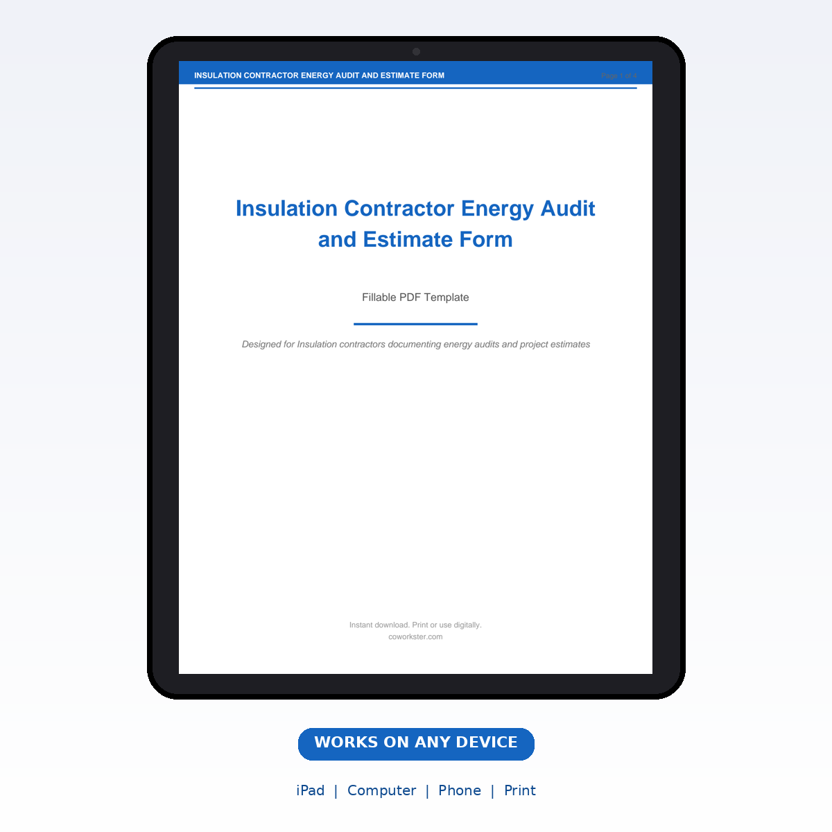 A 4 page fillable PDF template designed for Insulation contractors documenting energy audits and project estimates. Covers everything you need in one organized, professional document. Just open it, fill in the fields, and you are ready to go. Works on any device or print it out.