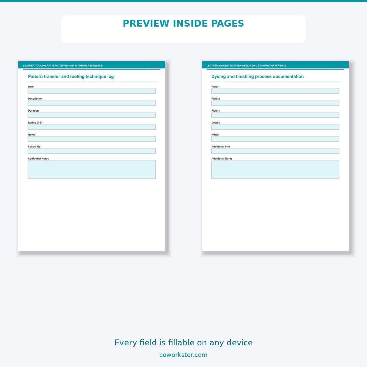 This template was built for Leather toolers documenting patterns and stamp impression results. Whether you are just getting started or have been at it for years, having a proper system saves you time and keeps everything in one place. No more scattered notes, forgotten details, or reinventing the wheel every time.